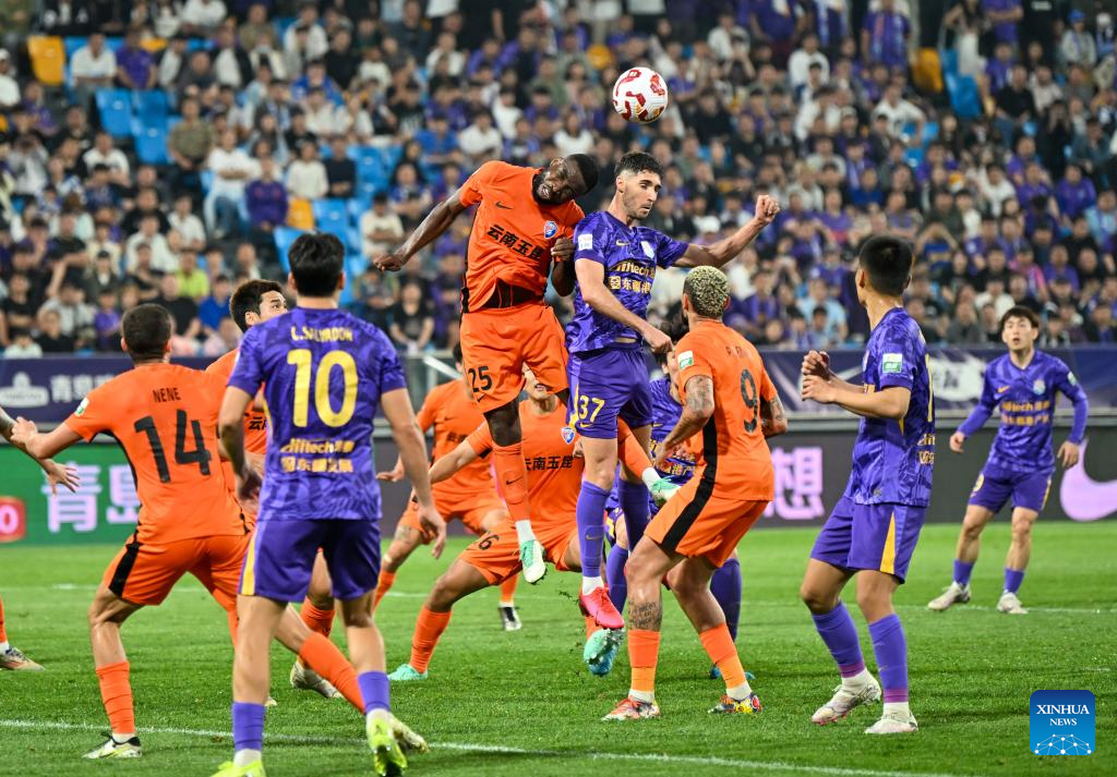 Oscar Taty Maritu (top L) of Yunnan Yukun vies for a header with Juan Antonio Ros (top R) of Tianjin Jinmen Tiger during the 12nd round match between Tianjin Jinmen Tiger and Yunnan Yukun at the 2025 season Chinese Football Super League (CSL) in north China's Tianjin, May 11, 2025. (Xinhua/Sun Fanyue)