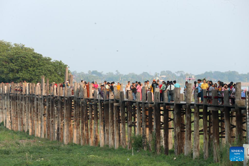 People walk on the U Bein Bridge in Mandalay, Myanmar, May 11, 2025. (Xinhua/Myo Kyaw Soe)