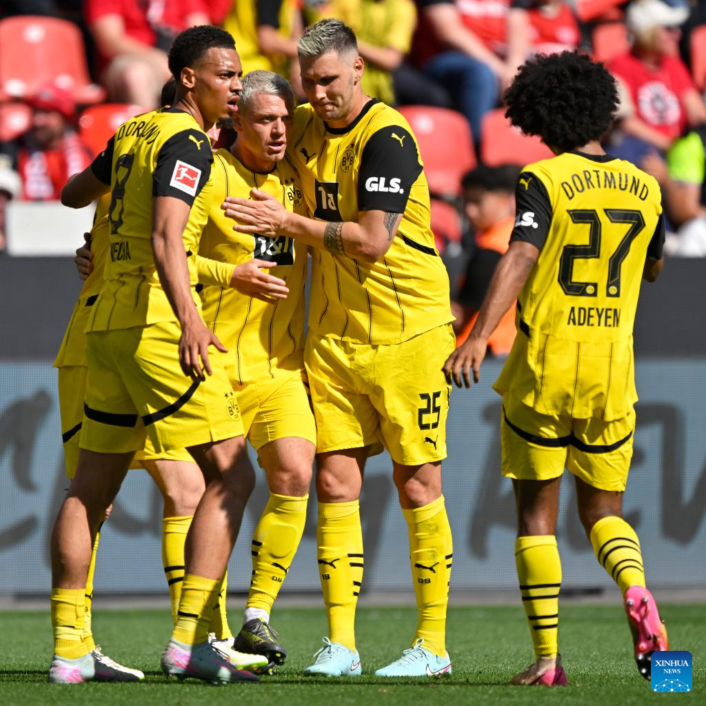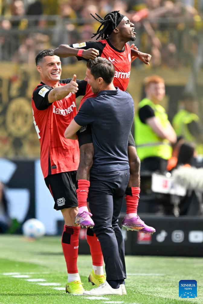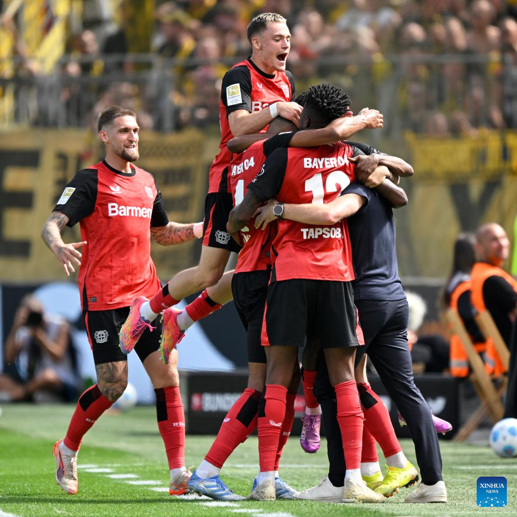 Karim Adeyemi(1st R) of Borussia Dortmund celebrates scoring with his teammates during the first division of Bundesliga football match between Bayer 04 Leverkusen and Borussia Dortmund in Leverkusen, Germany, May 11, 2025. (Photo by Ulrich Hufnagel/Xinhua)