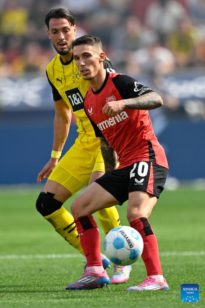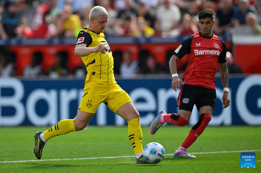 Piero Hincapie (R) of Bayer 04 Leverkusen vies with Julian Ryerson of Borussia Dortmund during the first division of Bundesliga football match between Bayer 04 Leverkusen and Borussia Dortmund in Leverkusen, Germany, May 11, 2025. (Photo by Ulrich Hufnagel/Xinhua)