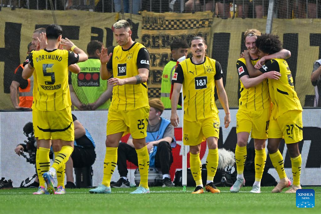 Julian Ryerson (2nd L) of Borussia Dortmund celebrates scoring with his teammates during the first division of Bundesliga football match between Bayer 04 Leverkusen and Borussia Dortmund in Leverkusen, Germany, May 11, 2025. (Photo by Ulrich Hufnagel/Xinhua)