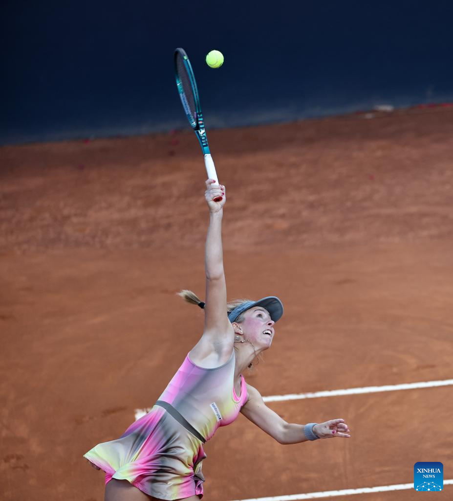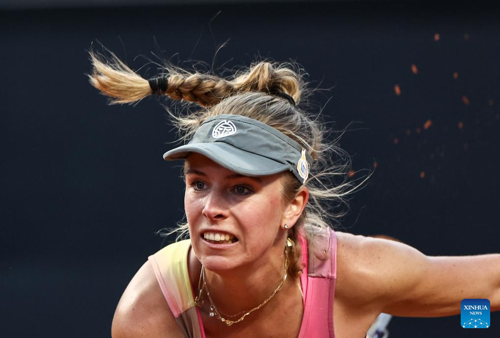 Magdalena Frech reacts during the women's singles round of 32 match between Magdalena Frech of Poland and Zheng Qinwen of China at the WTA Italian Open in Rome, Italy, May 11, 2025. (Xinhua/Li Jing)