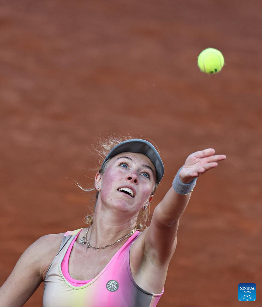 Magdalena Frech serves during the women's singles round of 32 match between Magdalena Frech of Poland and Zheng Qinwen of China at the WTA Italian Open in Rome, Italy, May 11, 2025. (Xinhua/Li Jing)