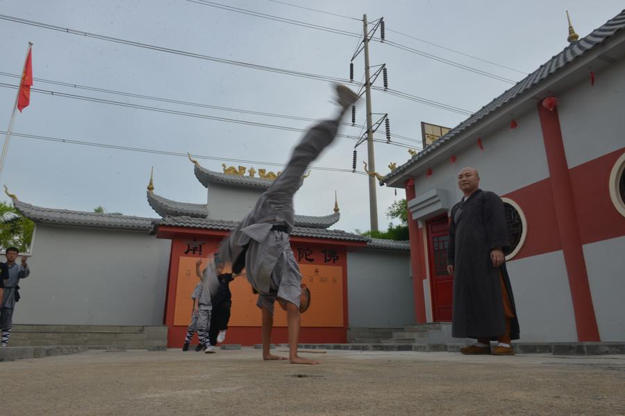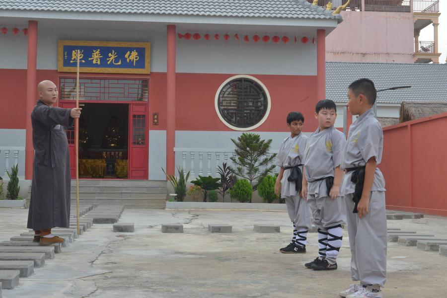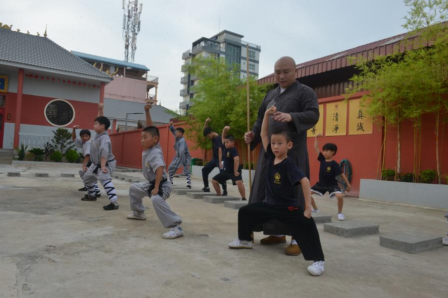 PHNOM PENH, May 12 (Xinhua) -- Yue Hanjun practices Chinese Shaolin Kung Fu martial arts here at the Cambodia Shaolin Temple Cultural Center four days a week, believing that the age-old martial arts will improve his physical fitness, mental discipline, and self-confidence.