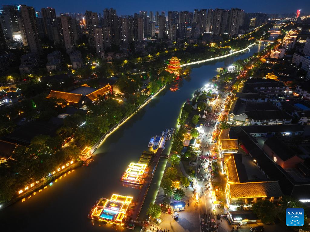 An aerial drone photo taken on May 10, 2025 shows people watching performances at a section of the cultural corridor in Huai'an, east China's Jiangsu Province.