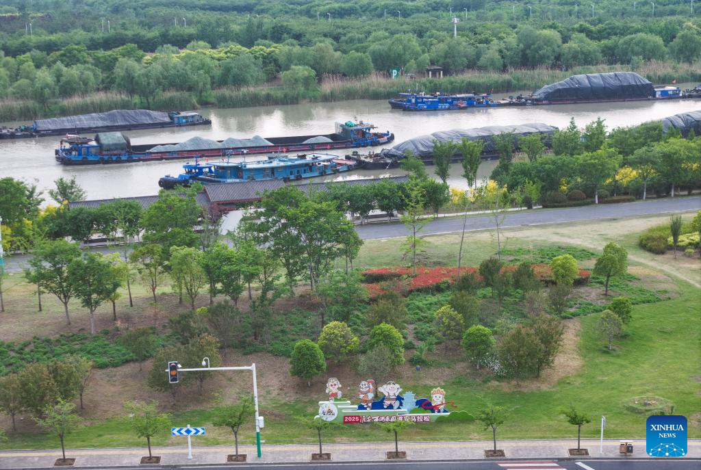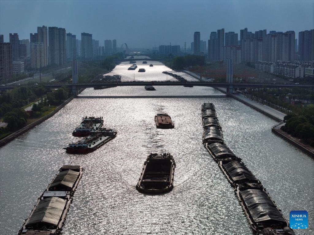 An aerial drone photo taken on May 10, 2025 shows ships sailing along the Huai'an section of the Grand Canal in Huai'an, east China's Jiangsu Province.