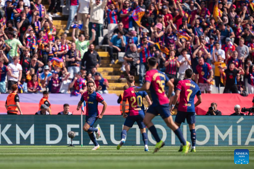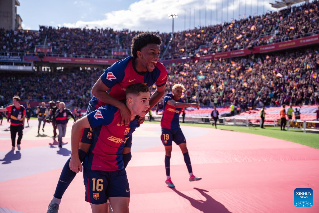 Players of FC Barcelona celebrate a goal during the Laliga football match between FC Barcelona and Real Madrid in Lluis Companys Olympic Stadium, Barcelona, Spain, on May 11, 2025. (Photo by Joan Gosa/Xinhua)