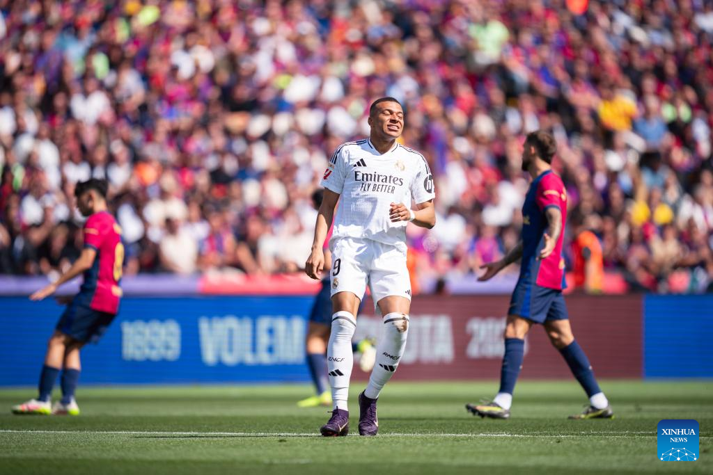 Kylian Mbappe of Real Madrid reacts during the Laliga football match between FC Barcelona and Real Madrid in Lluis Companys Olympic Stadium, Barcelona, Spain, on May 11, 2025. (Photo by Joan Gosa/Xinhua)