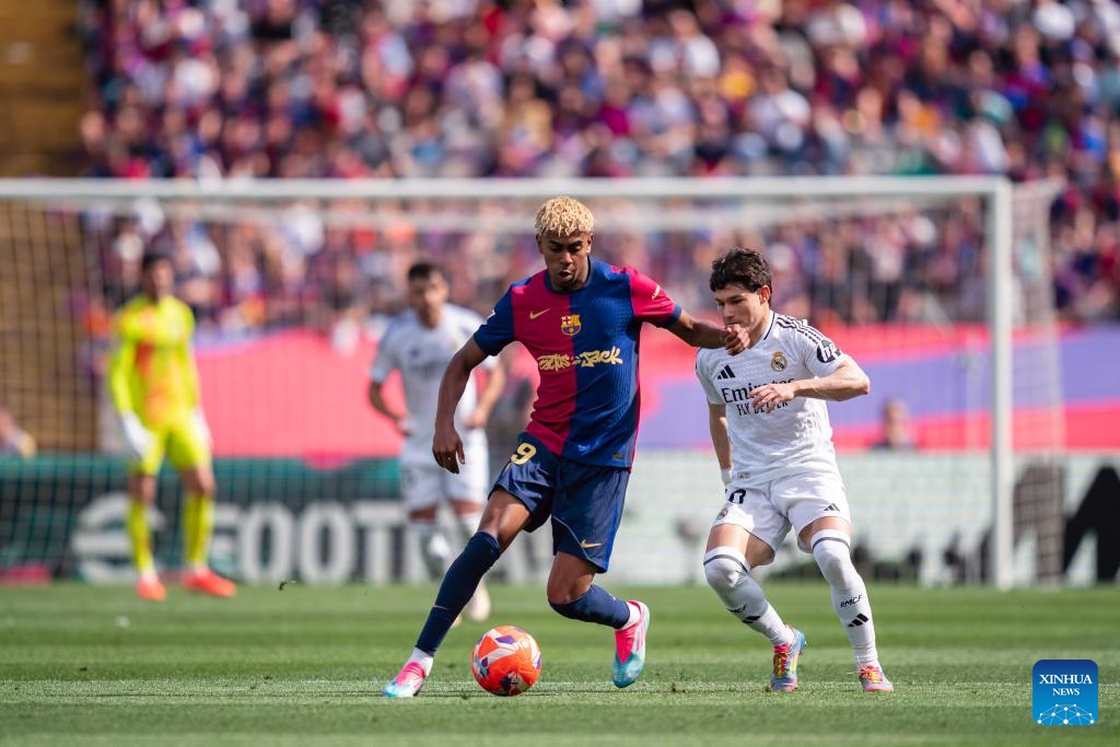 Lamine Yamal (L) of FC Barcelona vies with Fran Garcia of Real Madrid during the Laliga football match between FC Barcelona and Real Madrid in Lluis Companys Olympic Stadium, Barcelona, Spain, on May 11, 2025. (Photo by Joan Gosa/Xinhua)