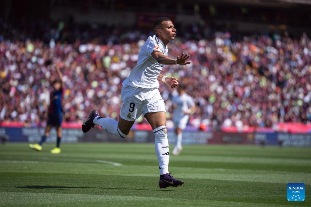 Kylian Mbappe of Real Madrid celebrates a goal during the Laliga football match between FC Barcelona and Real Madrid in Lluis Companys Olympic Stadium, Barcelona, Spain, on May 11, 2025. (Photo by Joan Gosa/Xinhua)