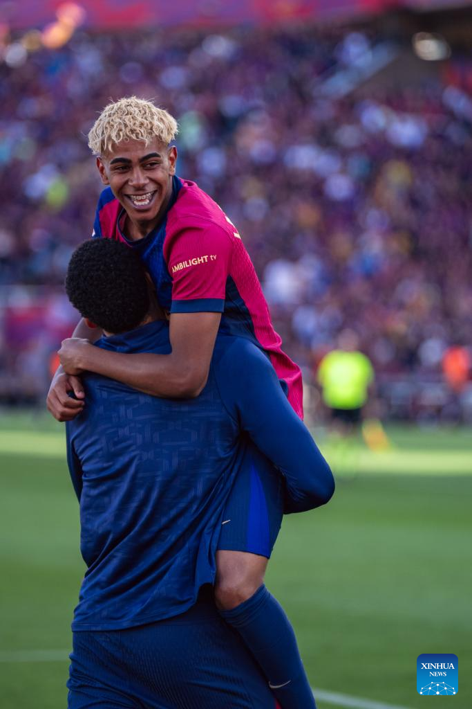 Lamine Yamal of FC Barcelona celebrates the victory after the Laliga football match between FC Barcelona and Real Madrid in Lluis Companys Olympic Stadium, Barcelona, Spain, on May 11, 2025. (Photo by Joan Gosa/Xinhua)