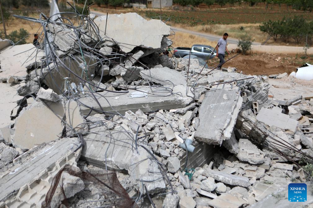Palestinians are seen among rubble after Israeli excavators demolished a house in the village of Idna, west of the West Bank city of Hebron, May 12, 2025. (Photo by Mamoun Wazwaz/Xinhua)