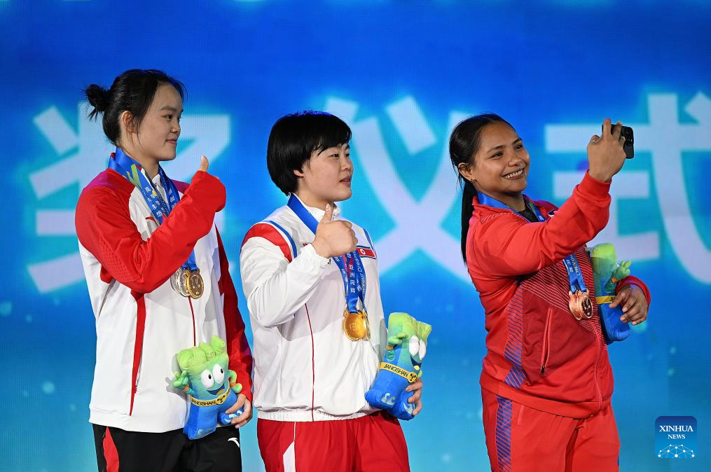 Total gold medalist Song Kuk Hyang (C) of the Democratic People's Republic of Korea (DPRK), silver medalist Yang Qiuxia (L) of China and bronze medalist Kristel Macrohon of the Philippines take selfies during the awarding ceremony for the women's 71kg competition at 2025 Asian Weightlifting Championships in Jiangshan, east China's Zhejiang Province, May 13, 2025. (Xinhua/Hou Zhaokang)
