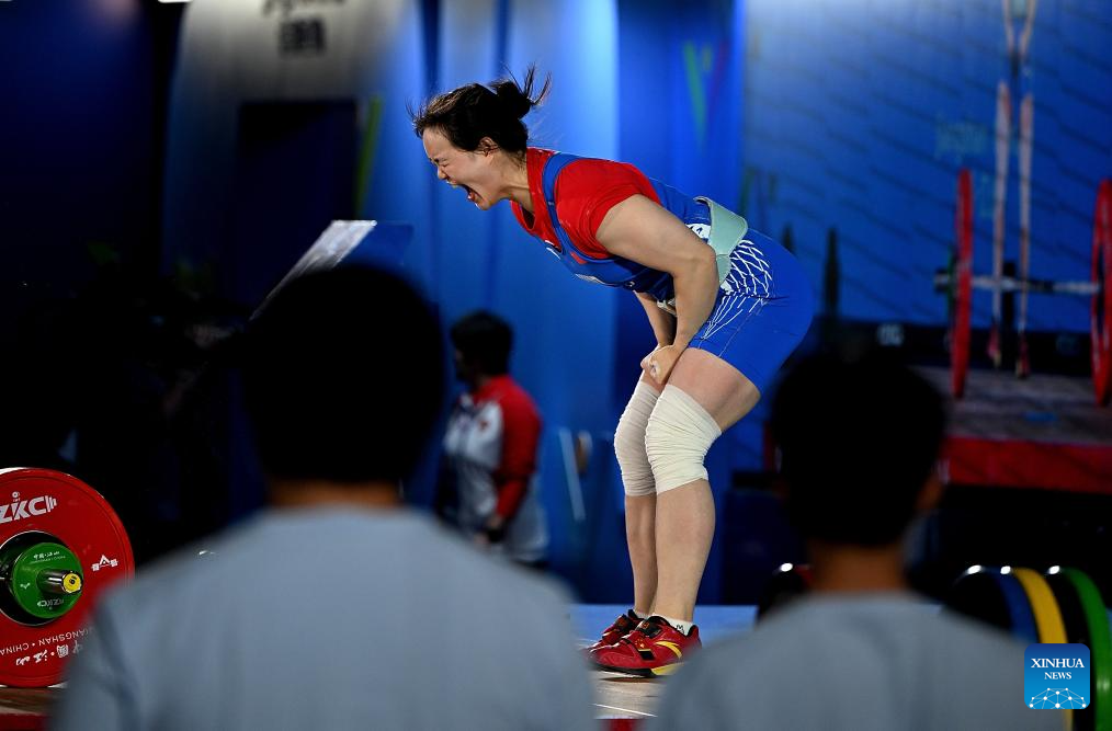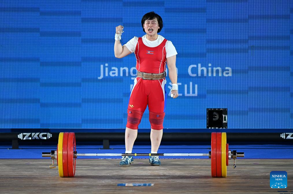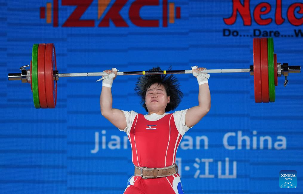 Song Kuk Hyang of the Democratic People's Republic of Korea (DPRK) competes during the women's 71kg competition at 2025 Asian Weightlifting Championships in Jiangshan, east China's Zhejiang Province, May 13, 2025. (Xinhua/Hou Zhaokang)