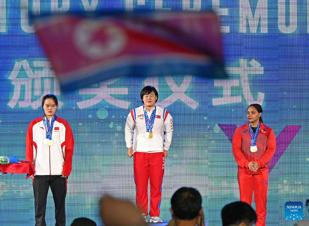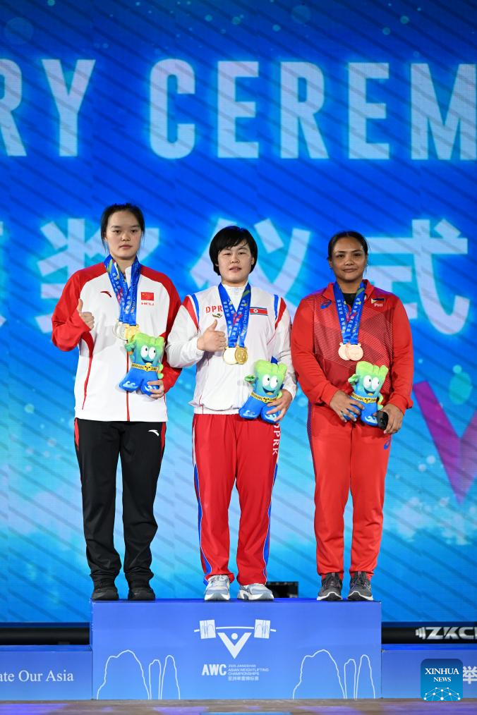 Total gold medalist Song Kuk Hyang (C) of the Democratic People's Republic of Korea (DPRK), silver medalist Yang Qiuxia (L) of China and bronze medalist Kristel Macrohon of the Philippines pose during the awarding ceremony for the women's 71kg competition at 2025 Asian Weightlifting Championships in Jiangshan, east China's Zhejiang Province, May 13, 2025. (Xinhua/Hou Zhaokang)