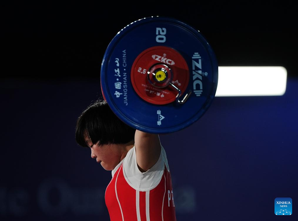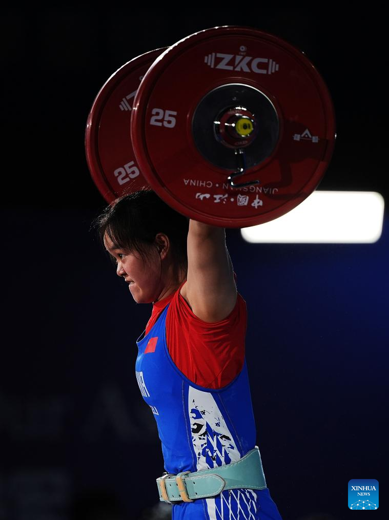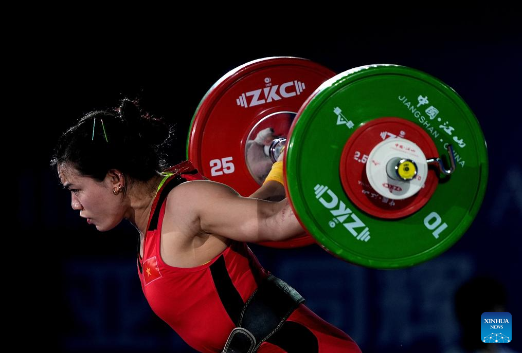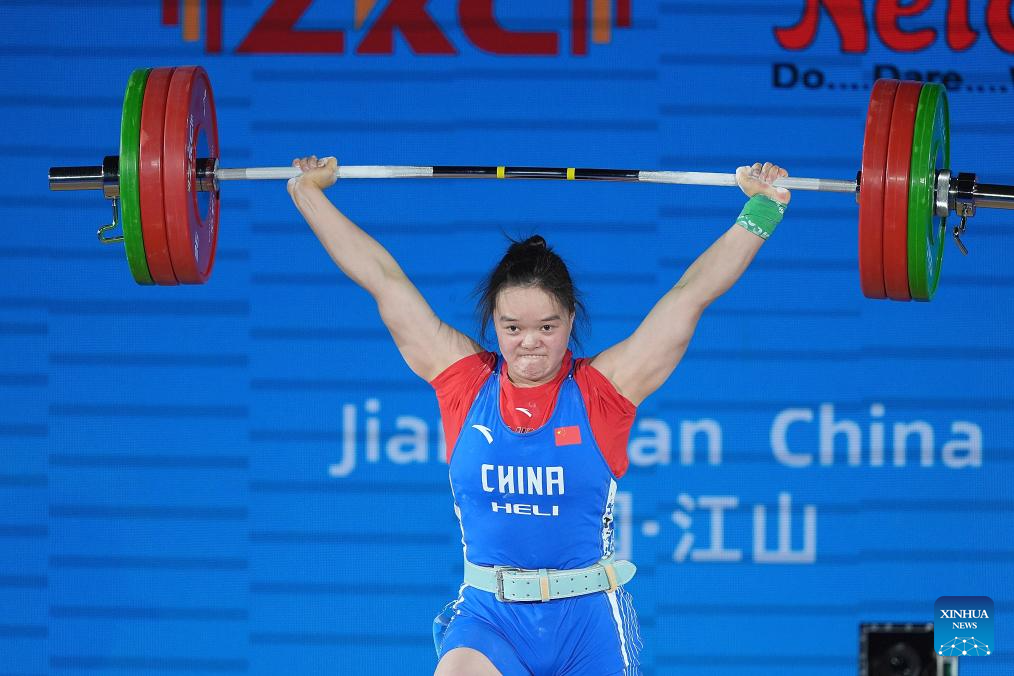 Yang Qiuxia of China competes during the women's 71kg competition at 2025 Asian Weightlifting Championships in Jiangshan, east China's Zhejiang Province, May 13, 2025. (Xinhua/Hou Zhaokang)