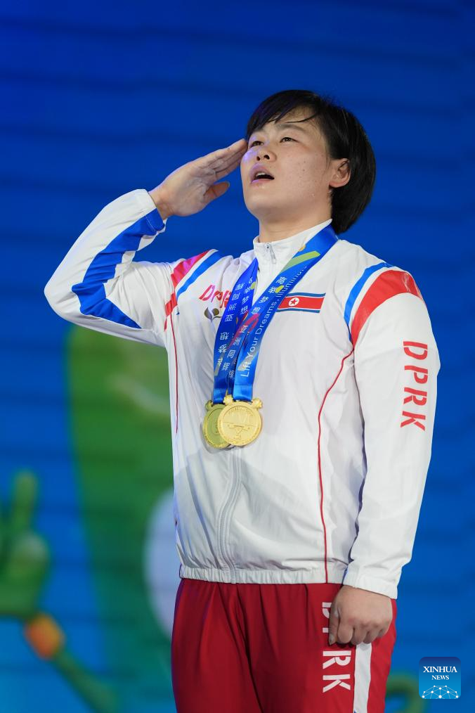 Total gold medalist Song Kuk Hyang of the Democratic People's Republic of Korea (DPRK) reacts during the awarding ceremony for the women's 71kg competition at 2025 Asian Weightlifting Championships in Jiangshan, east China's Zhejiang Province, May 13, 2025. (Xinhua/Hou Zhaokang)