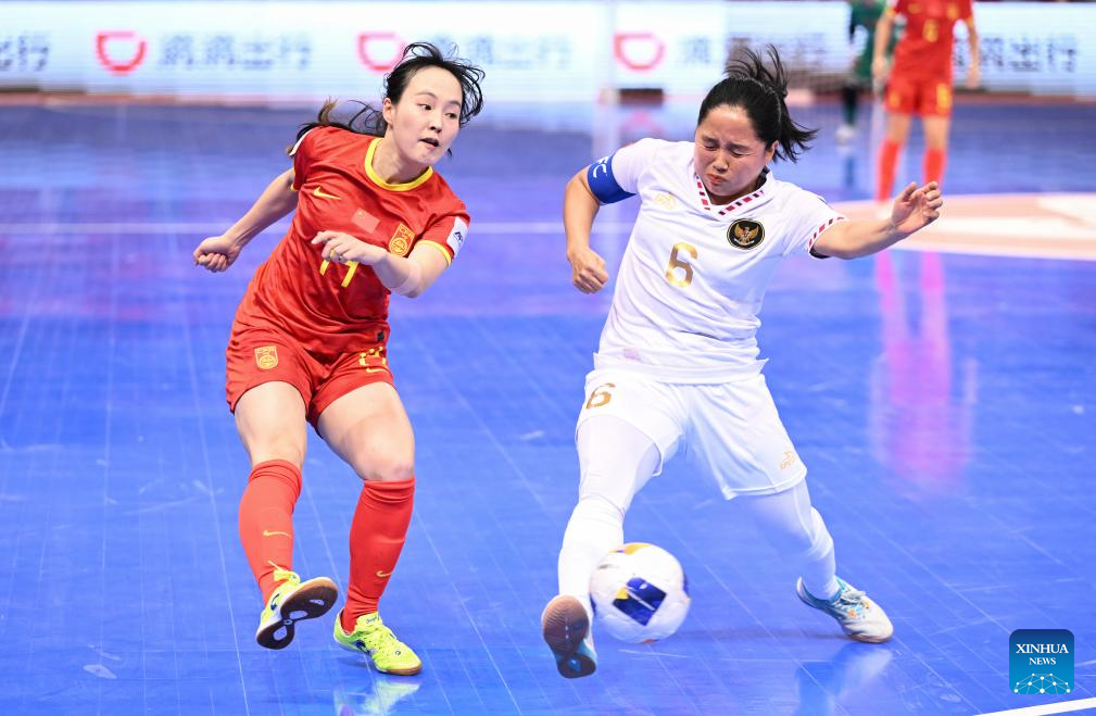 Zhan Zewen (L) of China shoots to score over Novita Murni Piranti of Indonesia during the quarterfinal match at AFC Women's Futsal Asian Cup 2025 in Hohhot, north China's Inner Mongolia Autonomous Region, May 13, 2025. (Xinhua/Bei He)