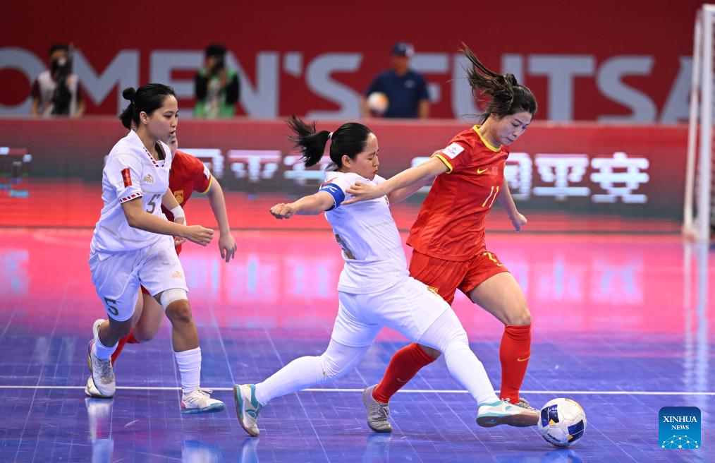 Zhang Rui of China shoots to score during the quarterfinal match between China and Indonesia at AFC Women's Futsal Asian Cup 2025 in Hohhot, north China's Inner Mongolia Autonomous Region, May 13, 2025. (Xinhua/Bei He)
