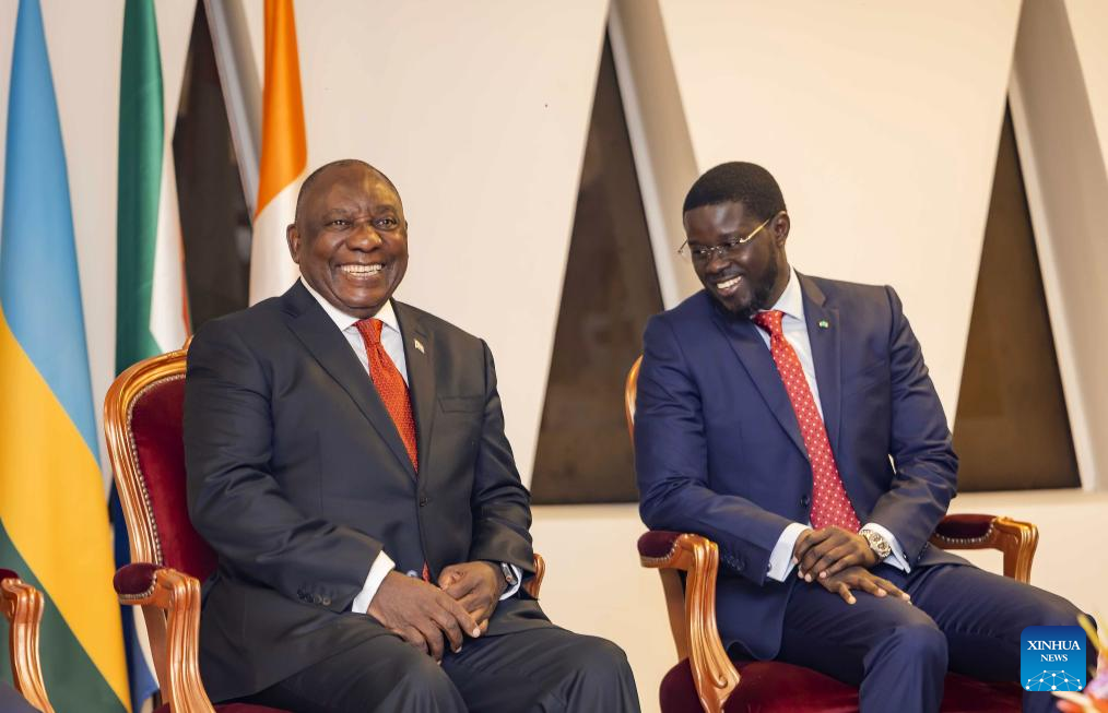 South African President Cyril Ramaphosa (L) meets with Senegalese President Bassirou Diomaye Faye during the opening ceremony of the 12th edition of the Africa CEO Forum in Abidjan, Cote d'Ivoire, May 12, 2025. The 12th edition of the Africa CEO Forum opened on Monday in Abidjan, under the theme "Can a New Deal Between the State and Private Sector Deliver the Continent a Winning Hand?" (Photo by Yvan Sonh/Xinhua)
