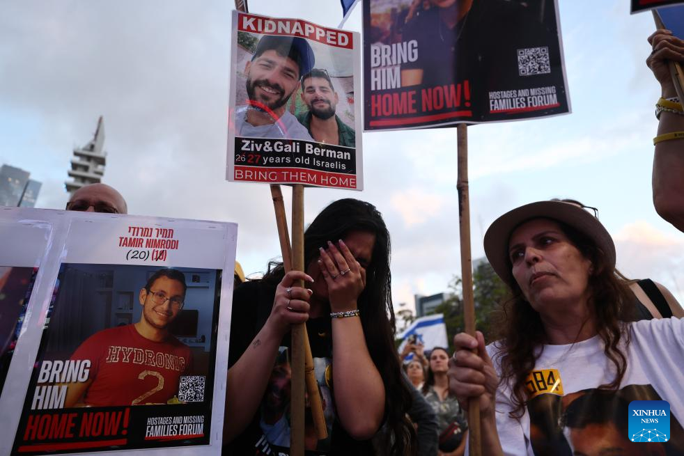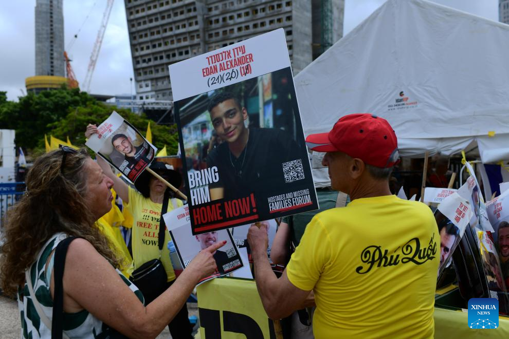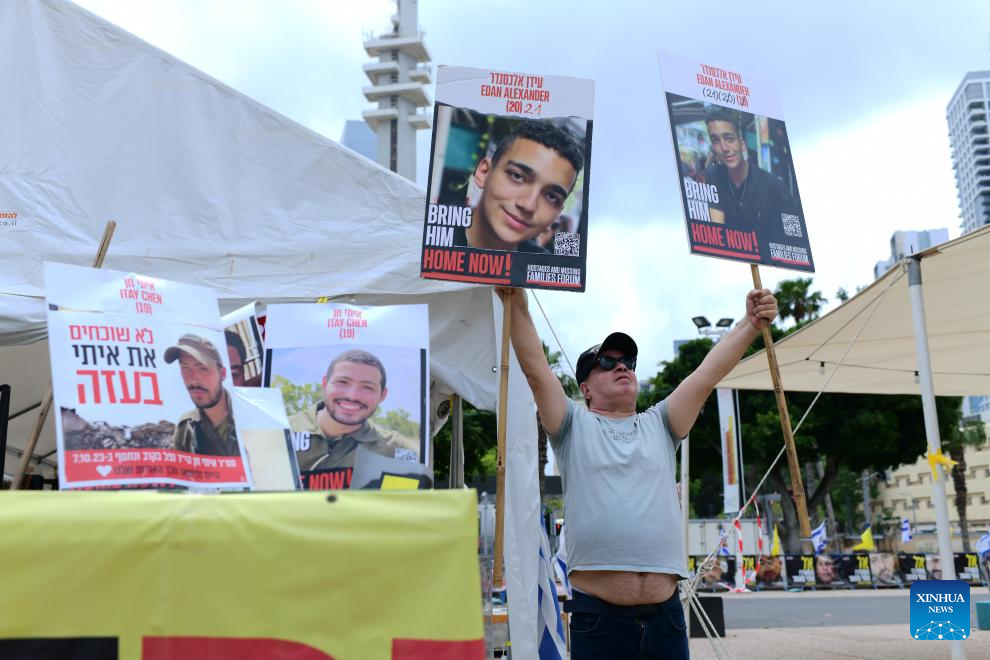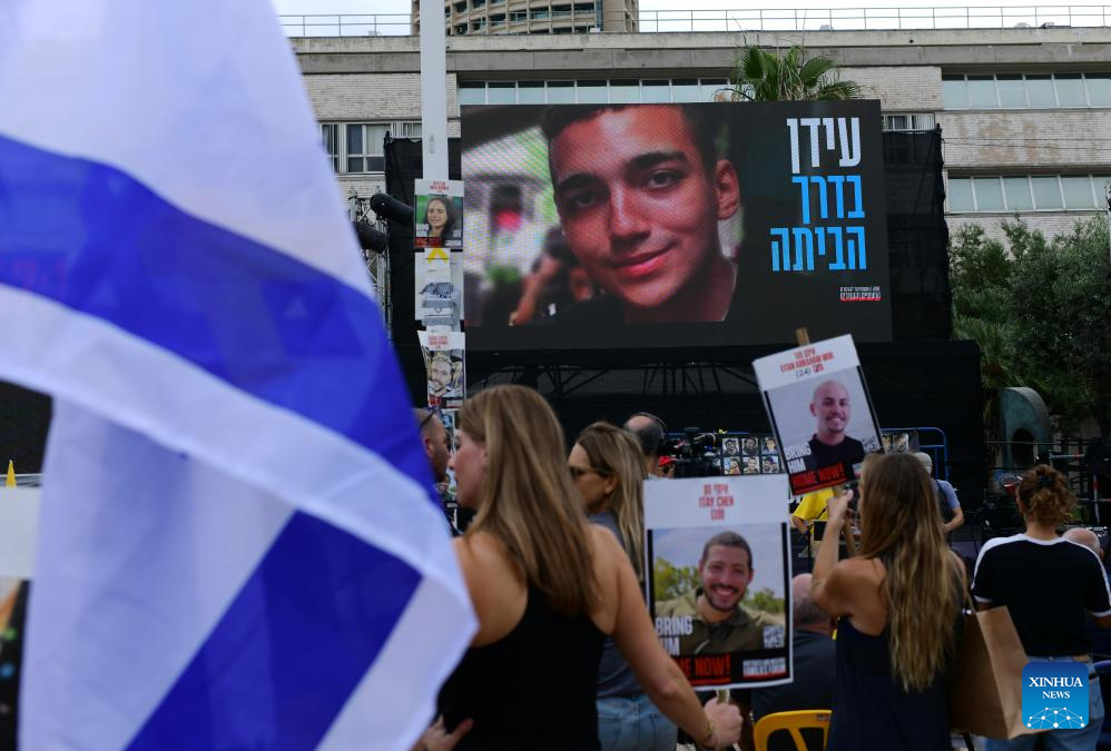 People wait to watch a live stream of the release of Israeli-U.S. hostage Edan Alexander from the Gaza Strip at a square in Tel Aviv, Israel, May 12, 2025. The United States informed Israel on Sunday that Hamas would release Edan Alexander, a U.S. born soldier in the Israeli army, who was abducted on Oct. 7, 2023, in a Hamas-led raid on southern Israel that resulted in the kidnapping of 251 people and the killing of about 1,200 others. (Tomer Neuberg/JINI via Xinhua)