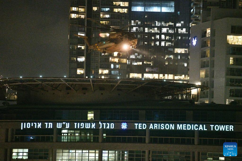 A helicopter carrying released hostage Edan Alexander arrives at a medical center in Tel Aviv, Israel, on May 12, 2025. Israeli-American hostage Edan Alexander arrived in Israel on Monday evening after being released from Gaza, where he was held in Hamas captivity for 19 months, Israel's Defense Ministry said in a statement. (JINI via Xinhua)