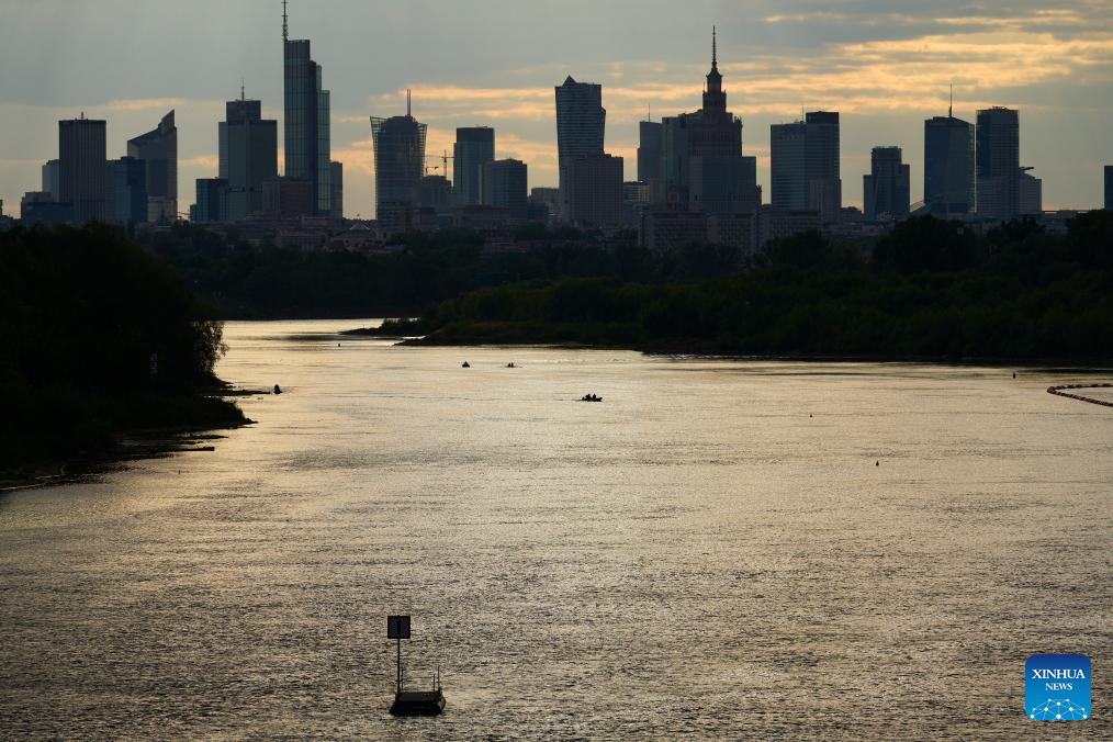 The sun sets over the city skyline as seen from a bridge spanning the Vistula River in Warsaw, Poland, on May 12, 2025. (Photo by Jaap Arriens/Xinhua)
