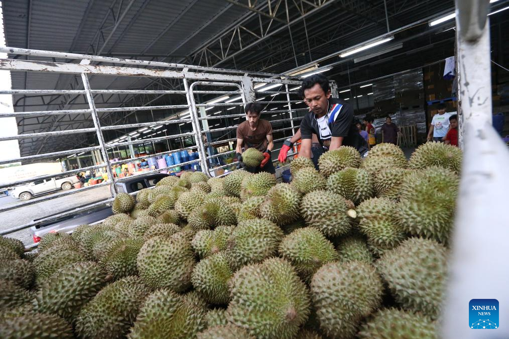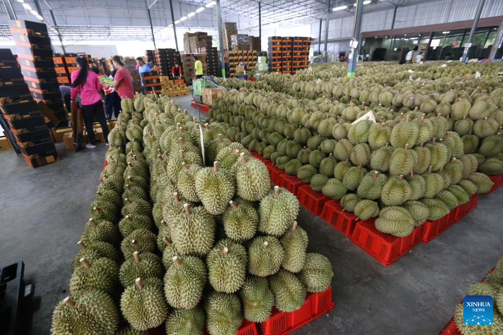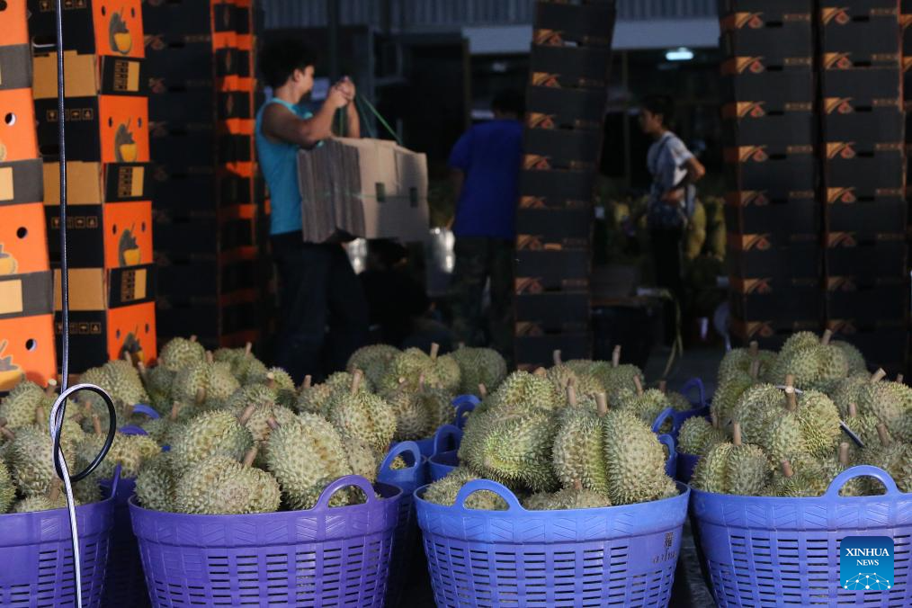 Durians in east Thailand greet its harvest peak in April and May. "Long" is one of the biggest durian processing and distribution centers in Thailand. It is where durians from various farms are collected, sorted, graded, and packed for export. (Xinhua/Rachen Sageamsak)