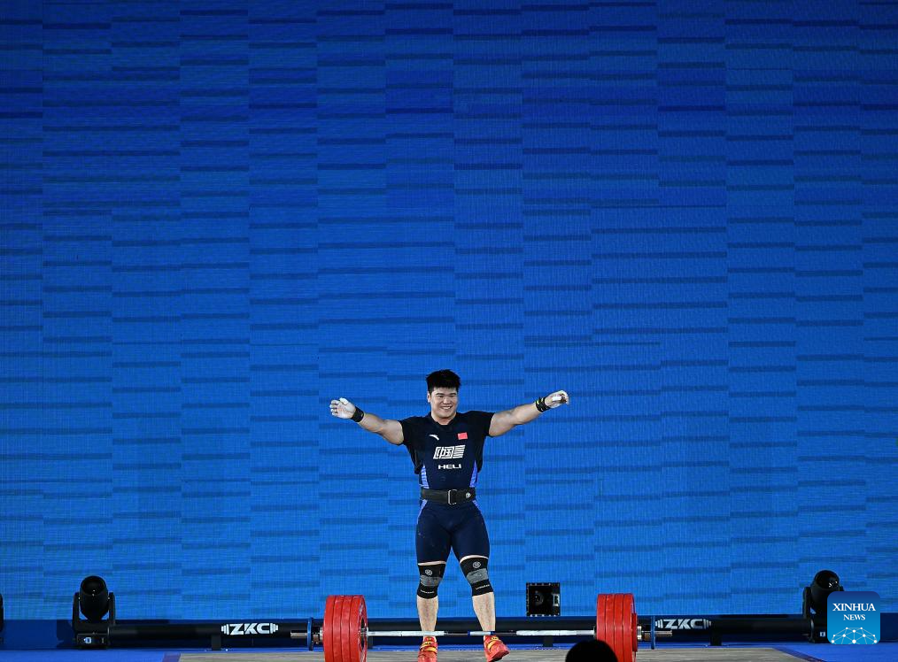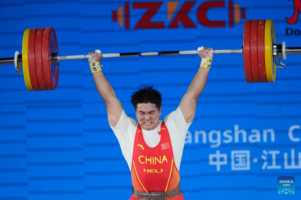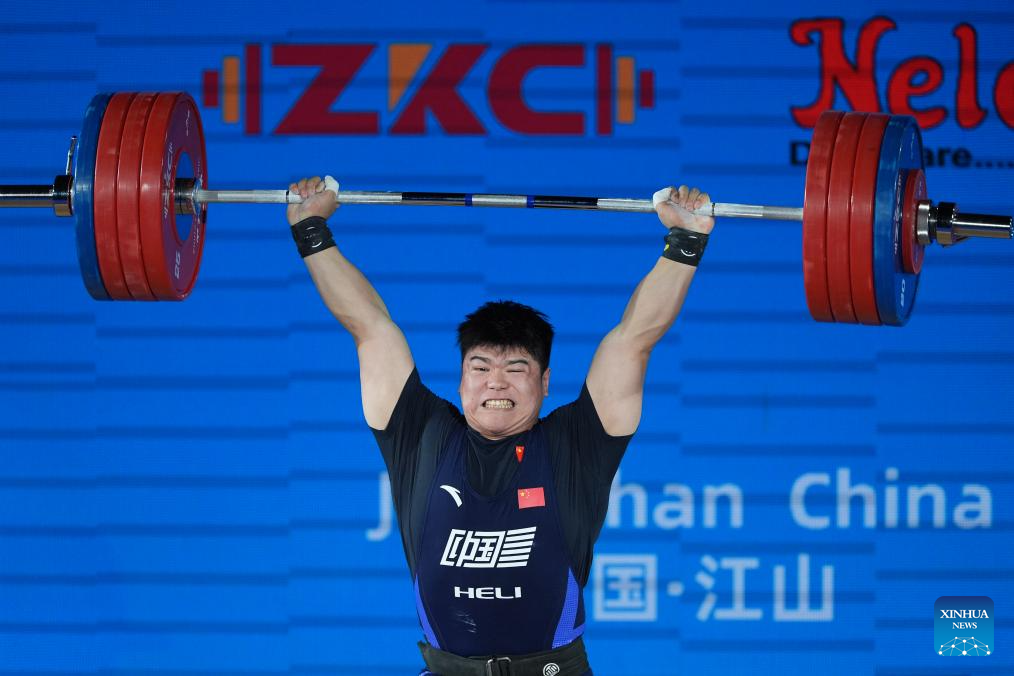 Liu Huanhua of China competes during the men's 102kg competition at the 2025 Asian Weightlifting Championships in Jiangshan, east China's Zhejiang Province, May 14, 2025. (Xinhua/Hou Zhaokang)