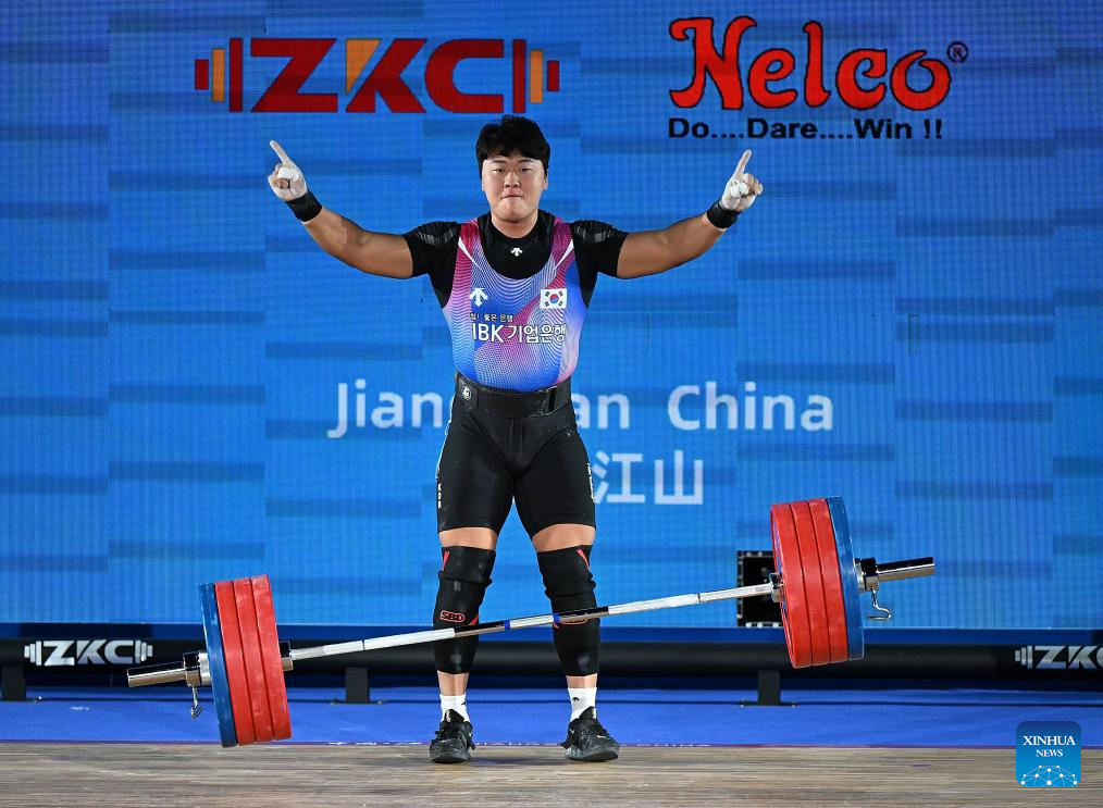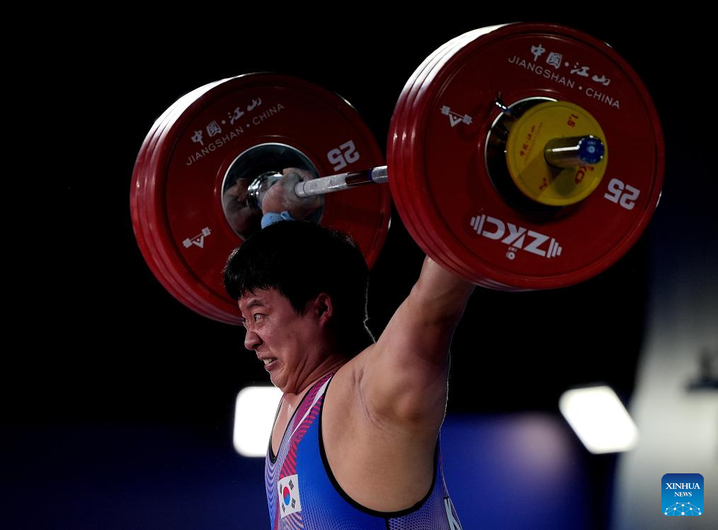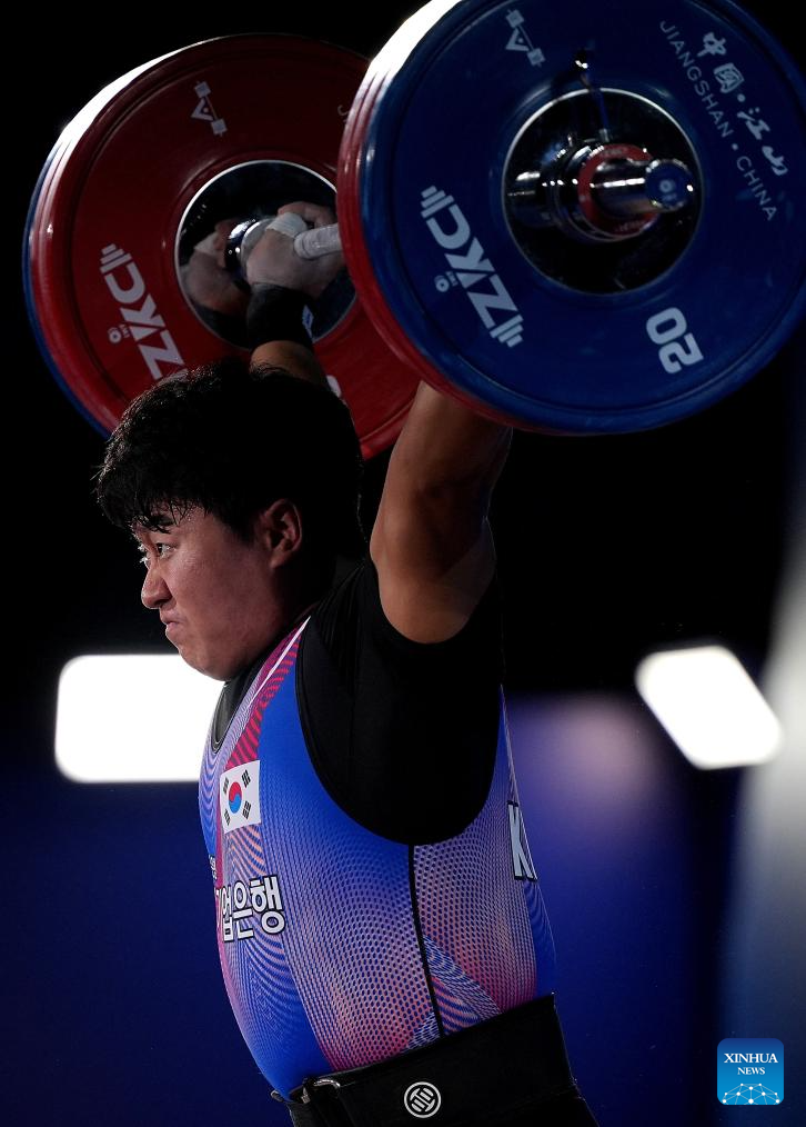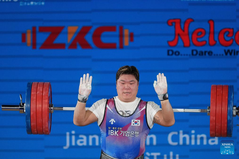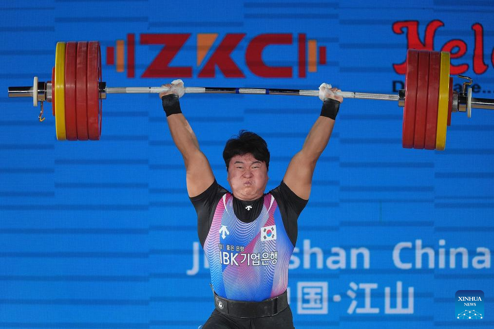 Jang Yeonhak of South Korea competes during the men's 109kg competition at 2025 Asian Weightlifting Championships in Jiangshan, east China's Zhejiang Province, May 14, 2025. (Xinhua/Hou Zhaokang)