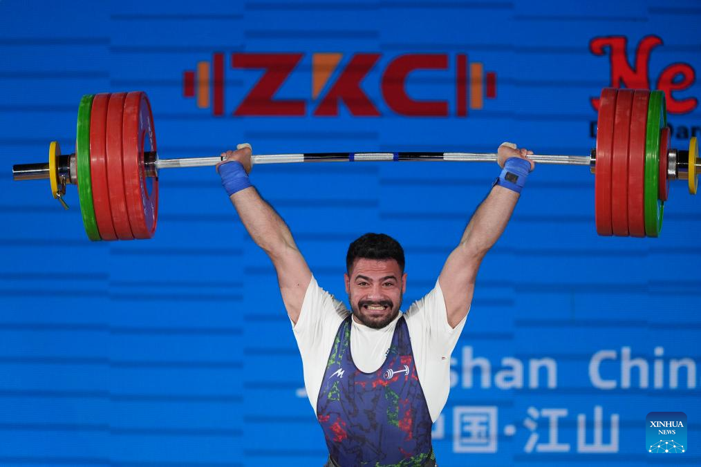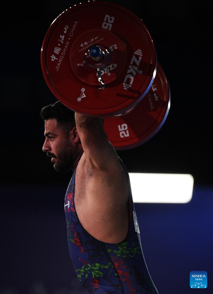 Alireza Moeini Sedeh of Iran competes during the men's 96kg competition at 2025 Asian Weightlifting Championships in Jiangshan, east China's Zhejiang Province, May 13, 2025. (Xinhua/Hou Zhaokang)