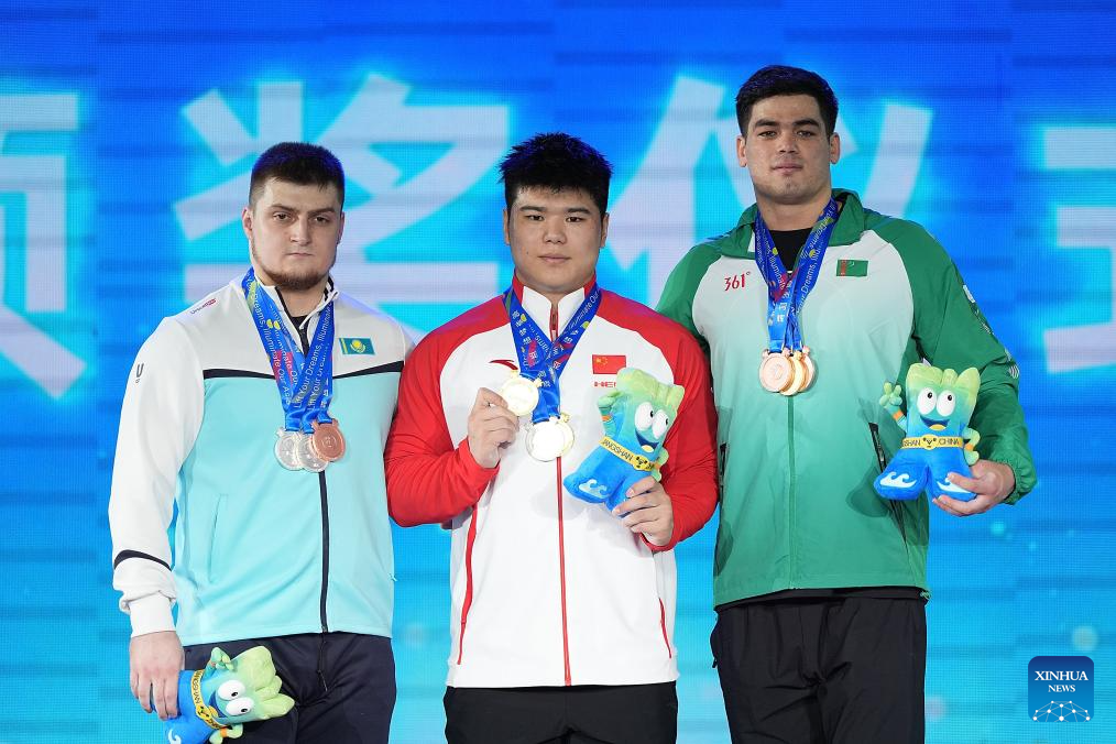 Total gold medalist Liu Huanhua (C) of China, silver medalist Artyom Antropov (L) of Kazakhstan and bronze medalist Davranbek Hasanbayev of Turkmenistan pose during the awarding ceremony for the men's 102kg competition at the 2025 Asian Weightlifting Championships in Jiangshan, east China's Zhejiang Province, May 14, 2025. (Xinhua/Hou Zhaokang)