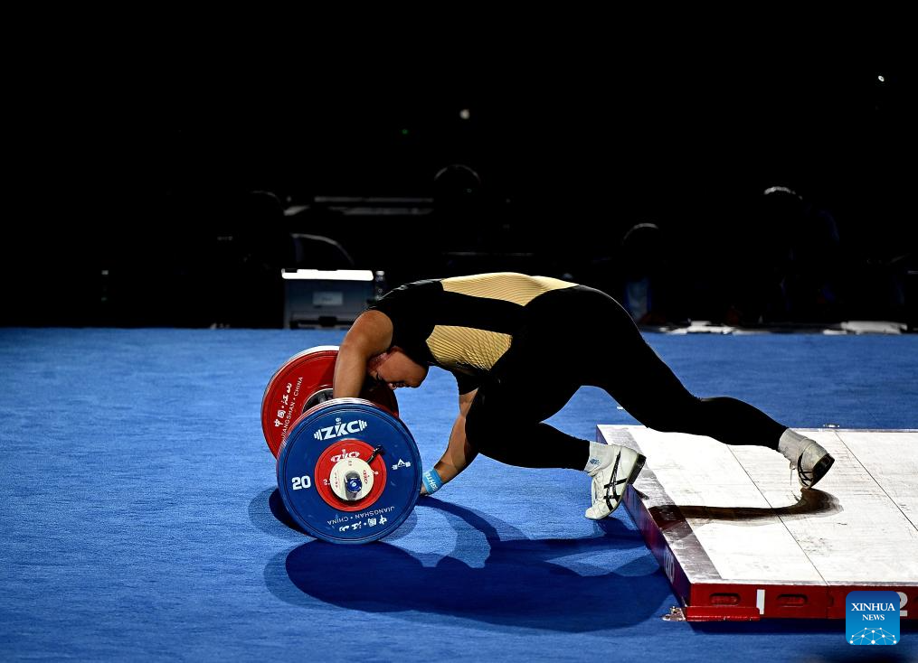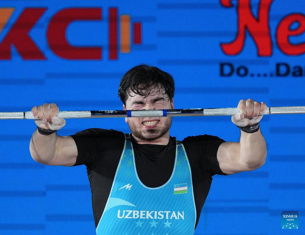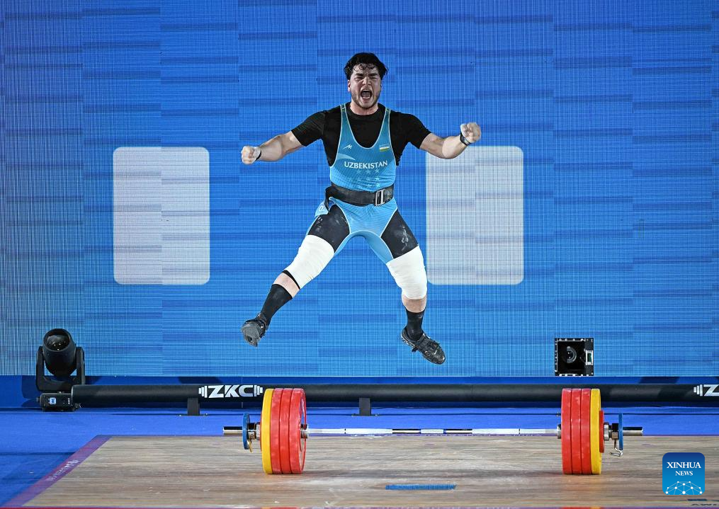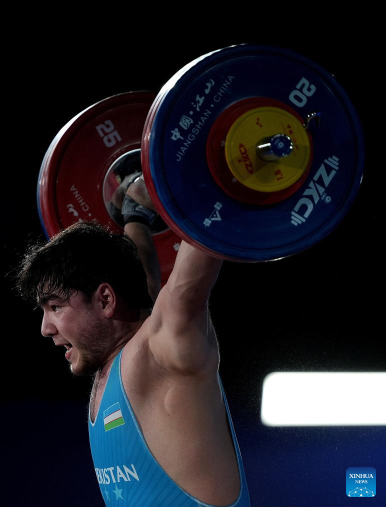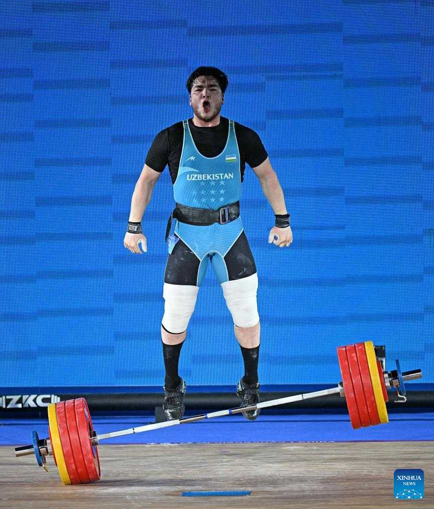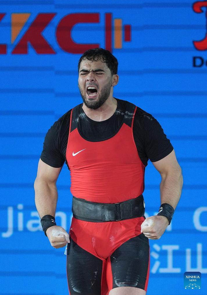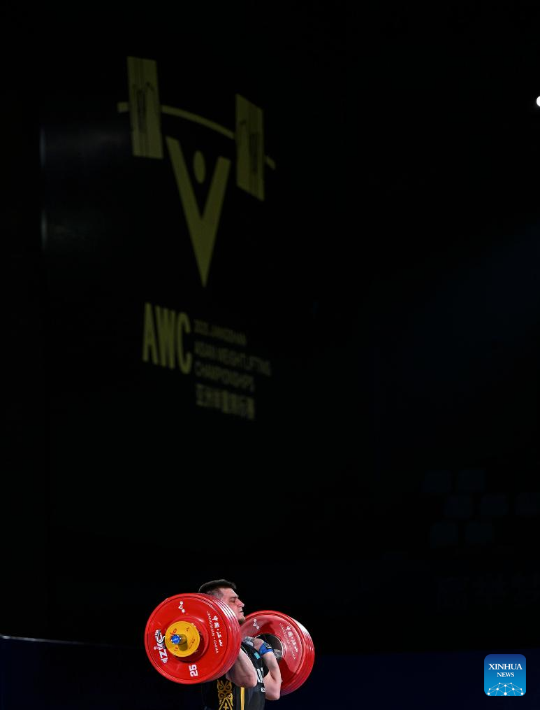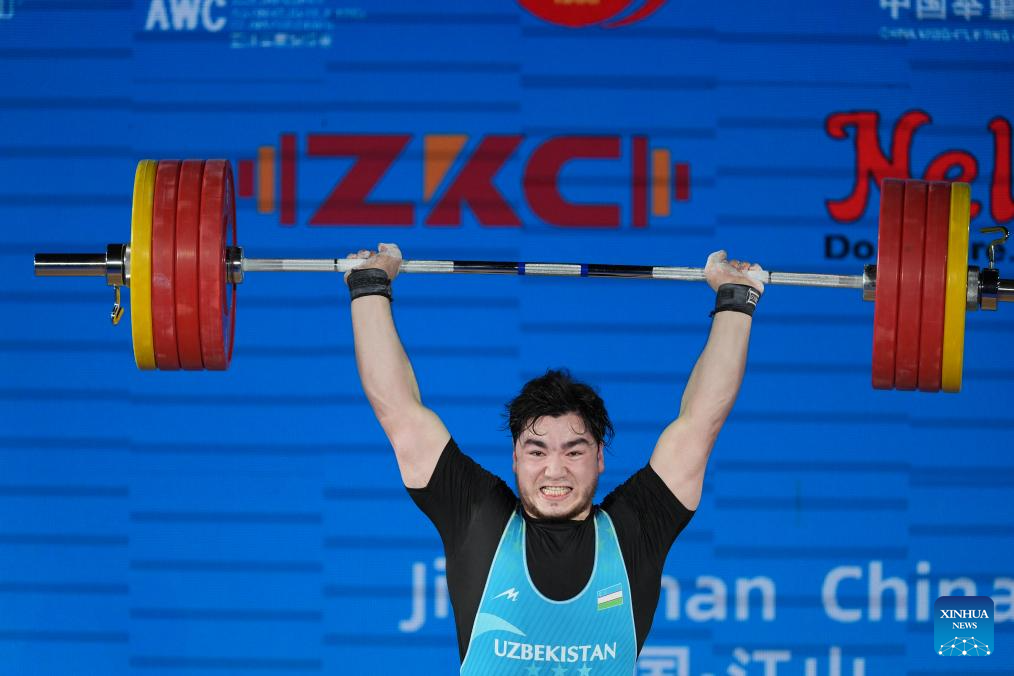 Akbar Djuraev of Uzbekistan competes during the men's 109kg competition at 2025 Asian Weightlifting Championships in Jiangshan, east China's Zhejiang Province, May 14, 2025. (Xinhua/Hou Zhaokang)