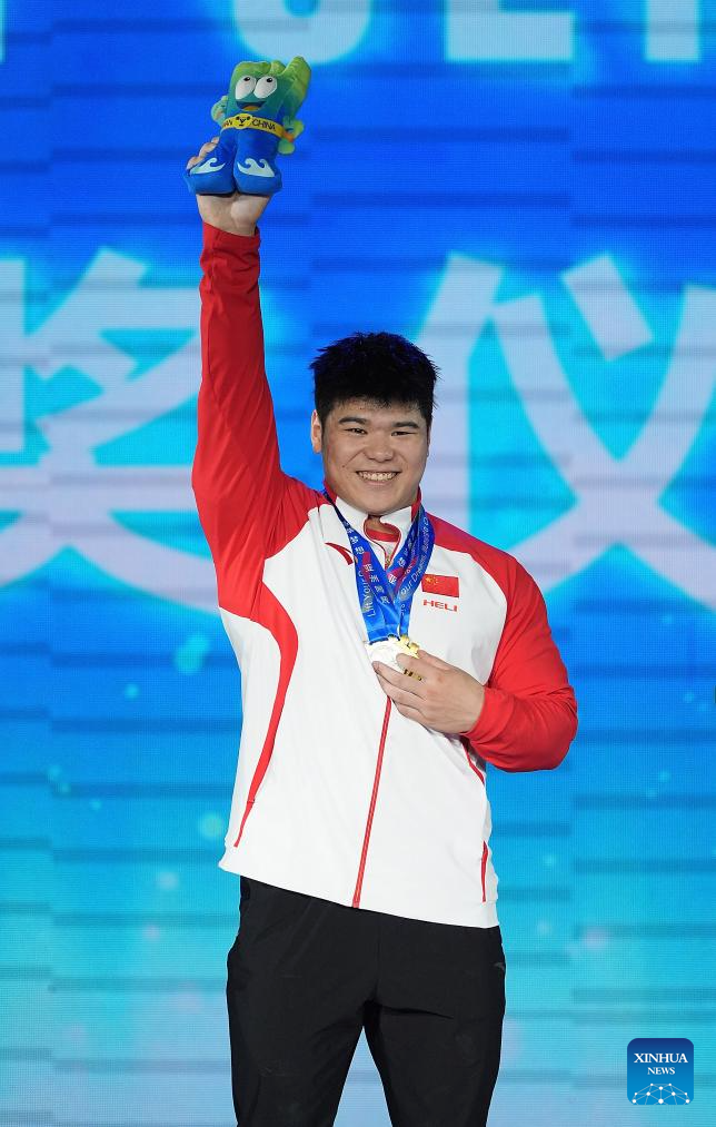 Total gold medalist Liu Huanhua of China reacts during the awarding ceremony for the men's 102kg competition at the 2025 Asian Weightlifting Championships in Jiangshan, east China's Zhejiang Province, May 14, 2025. (Xinhua/Hou Zhaokang)