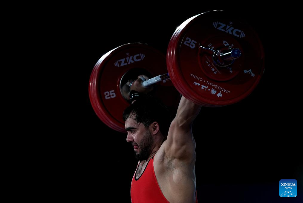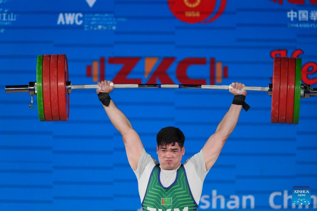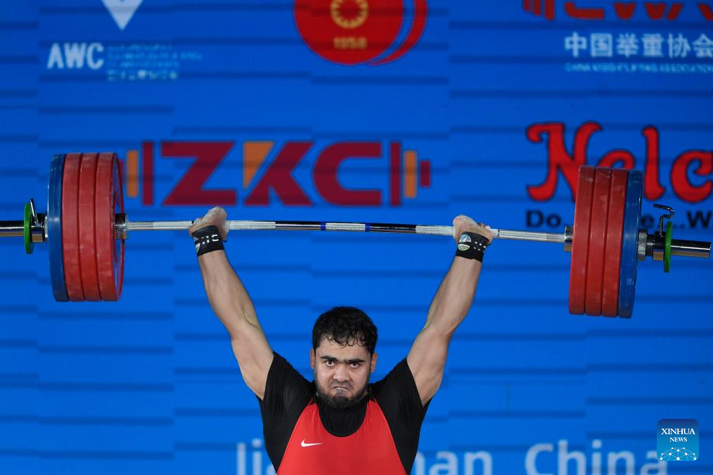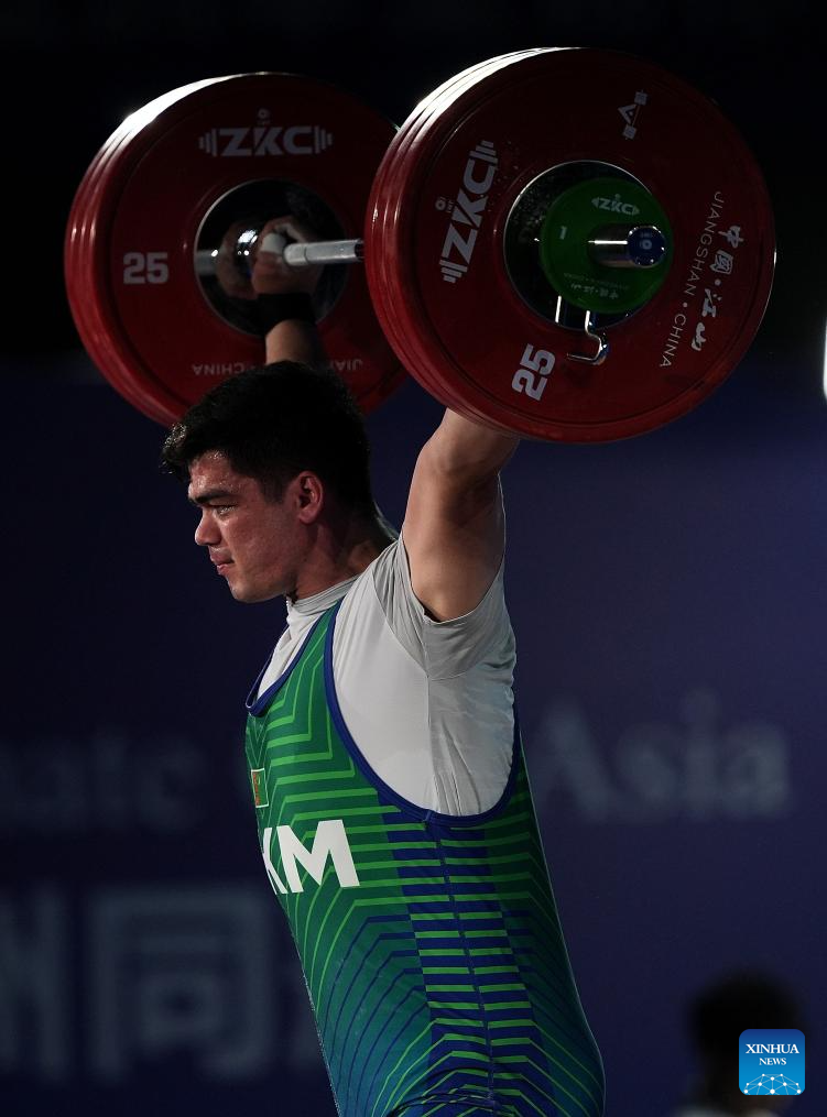 Davranbek Hasanbayev of Turkmenistan competes during the men's 102kg competition at the 2025 Asian Weightlifting Championships in Jiangshan, east China's Zhejiang Province, May 14, 2025. (Xinhua/Hou Zhaokang)