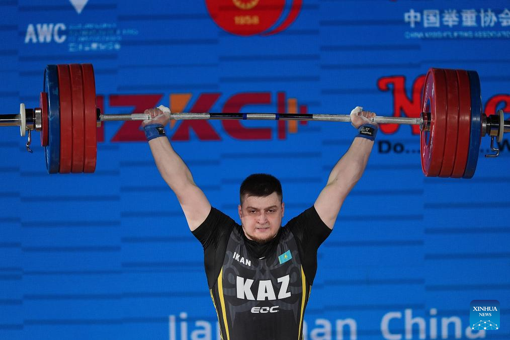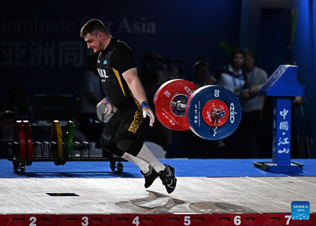 Artyom Antropov of Kazakhstan competes during the men's 102kg competition at the 2025 Asian Weightlifting Championships in Jiangshan, east China's Zhejiang Province, May 14, 2025. (Xinhua/Hou Zhaokang)