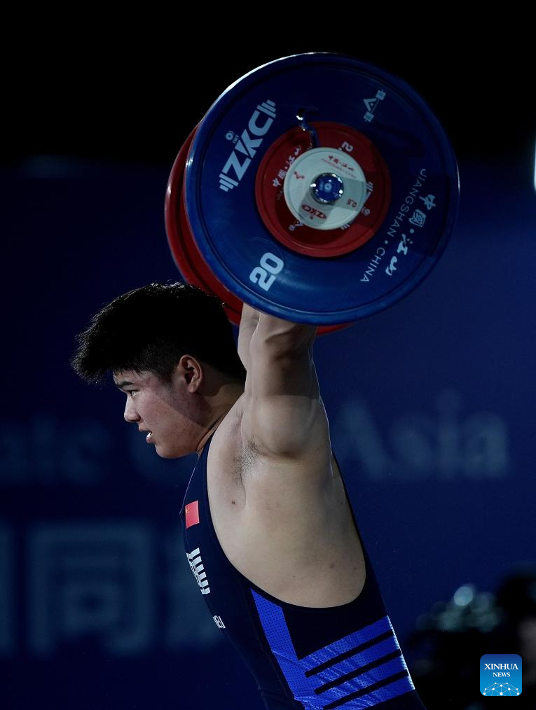 Qian Feixiang of China competes during the men's 96kg competition at 2025 Asian Weightlifting Championships in Jiangshan, east China's Zhejiang Province, May 13, 2025. (Xinhua/Hou Zhaokang)