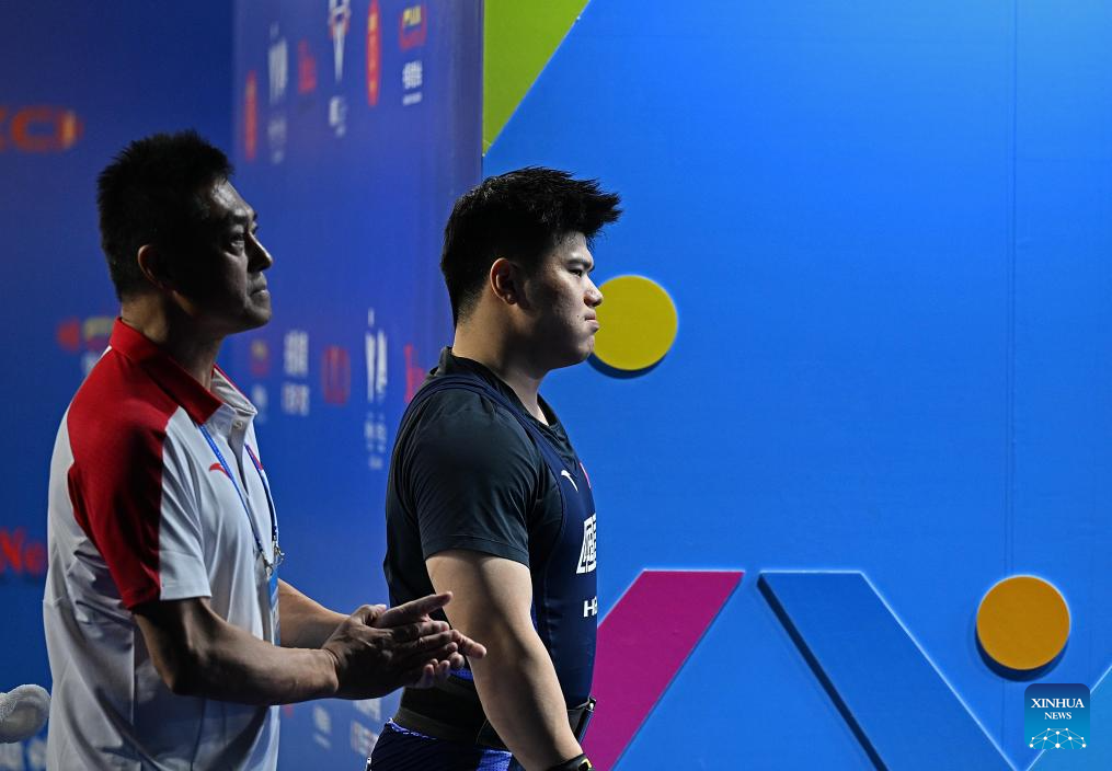 Liu Huanhua (R) of China prepares before the men's 102kg competition at the 2025 Asian Weightlifting Championships in Jiangshan, east China's Zhejiang Province, May 14, 2025. (Xinhua/Hou Zhaokang)