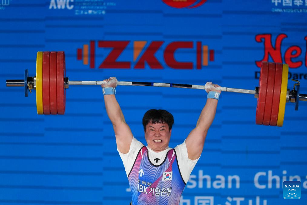 Won Jongbeom of South Korea competes during the men's 96kg competition at 2025 Asian Weightlifting Championships in Jiangshan, east China's Zhejiang Province, May 13, 2025. (Xinhua/Hou Zhaokang)