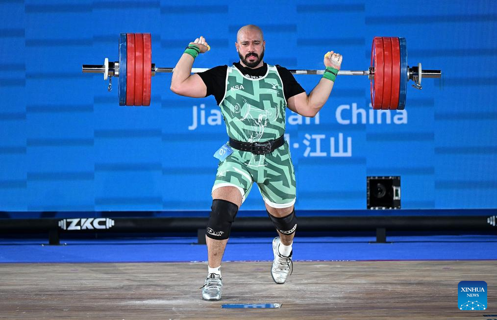 Ali Alkhazal of Saudi Arabia competes during the men's 109kg competition at 2025 Asian Weightlifting Championships in Jiangshan, east China's Zhejiang Province, May 14, 2025. (Xinhua/Hou Zhaokang)