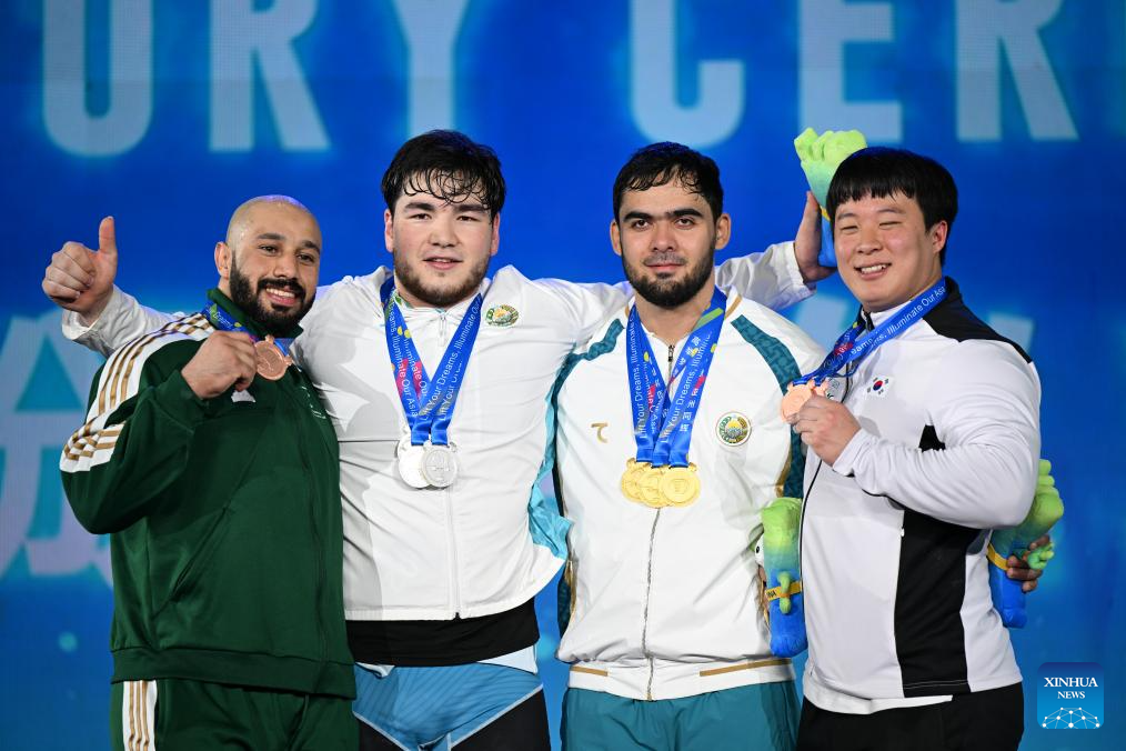 Overall gold medalist Akbar Djuraev (2nd R) of Uzbekistan, silver medalist Sharofiddin Amriddinov (2nd L) of Uzbekistan, bronze medalist Jang Yeonhak (R) of South Korea and bronze medalist of clean and jerk Ali Alkhazal of Saudi Arabia pose during the awarding ceremony for the men's 109kg competition at 2025 Asian Weightlifting Championships in Jiangshan, east China's Zhejiang Province, May 14, 2025. (Xinhua/Hou Zhaokang)