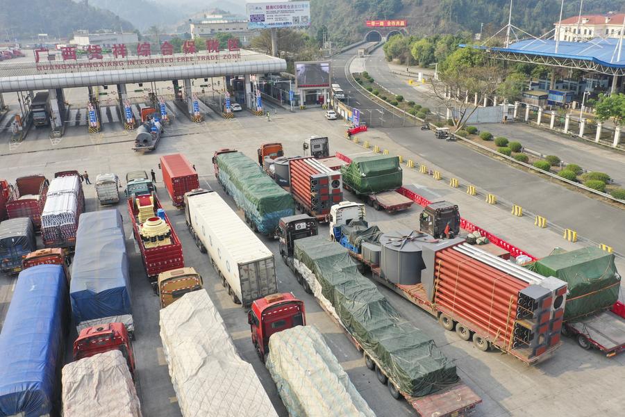 NANNING, May 14 (Xinhua) -- At 10:40 a.m. on Wednesday, convoys carrying electronic components, fresh vegetables, and daily necessities departed simultaneously from Nanning in south China's Guangxi Zhuang Autonomous Region and Kunming in southwest China's Yunnan Province, heading for Hanoi, the capital of Vietnam.
