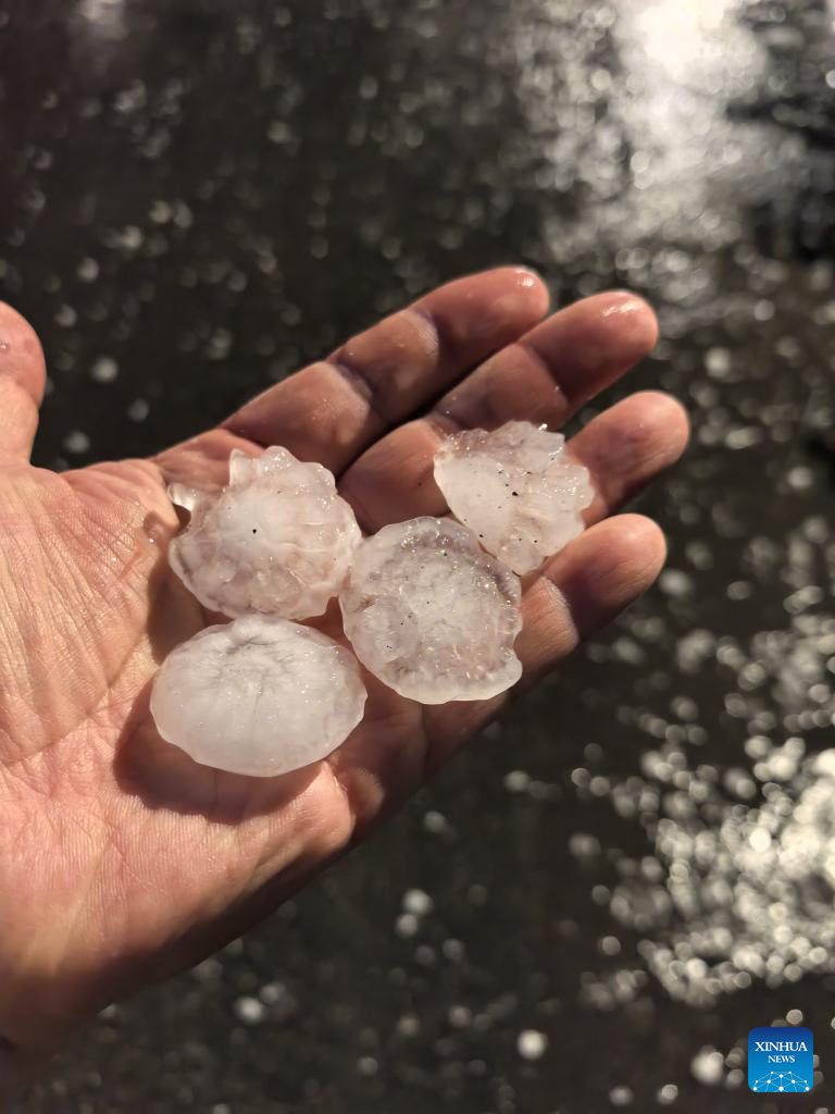 This photo taken on May 13, 2025 shows the hailstones in Xicheng District, Beijing, capital of China. Parts of Beijing saw strong winds and thunderstorms on Tuesday. (Xinhua/Li He)