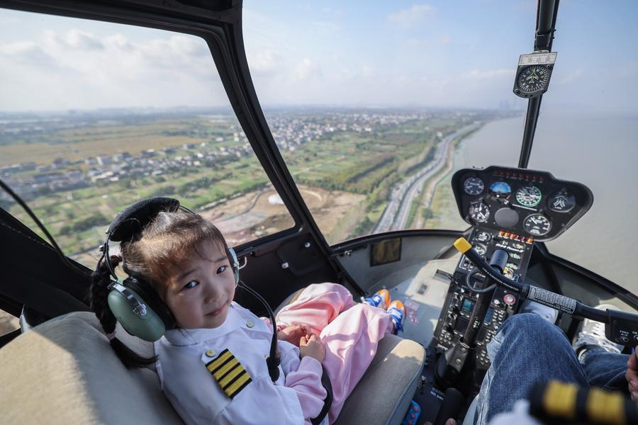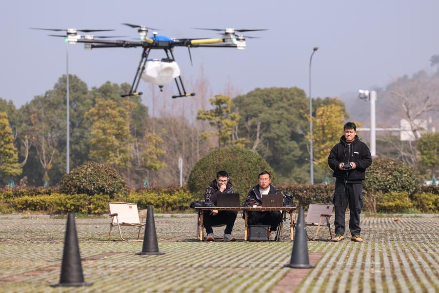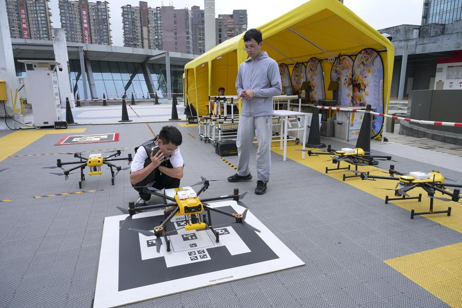 This photo taken on Oct. 7, 2024 shows a drone performance in Shenyang, northeast China's Liaoning Province. (Xinhua/Li Gang)A trainee (R) takes a practical drone training session at a low-altitude science and technology innovation base located in Jiangbei District, Ningbo, east China's Zhejiang Province, Feb. 28, 2025. (Xinhua/Jiang Han)A 5-seat eVTOL (electric vertical takeoff and landing) aircraft flies during a demonstration flight near Shekou Cruise Home port in Shenzhen, south China's Guangdong Province, Feb. 27, 2024. (Xinhua/Mao Siqian)A girl takes a helicopter from a helicopter flight base to enjoy the scenery of Taihu Lake from the air in Huzhou, east China's Zhejiang Province, Nov. 5, 2024. (Xinhua/Xu Yu)Staff members debug a food delivery drone on the top floor of a shopping mall in Shenzhen, south China's Guangdong Province, April 23, 2024. (Xinhua/Mao Siqian)A drone developed by Phoenix Wings, a cargo Unmaned Aerial Vehicle (UAV) company under China's express delivery giant SF Group, is pictured at the launching ceremony of the first batch of low-altitude economy (LAE) regulatory sandbox pilot projects held in Hong Kong, south China, March 20, 2025. (Xinhua/Chen Duo)A logistics drone loaded with goods and heading for Xuwen Port in Guangdong Province takes off from outside the exhibition hall of the China International Consumer Products Expo (CICPE) in Haikou, south China's Hainan Province, April 14, 2025. (Xinhua/Guo Cheng)■