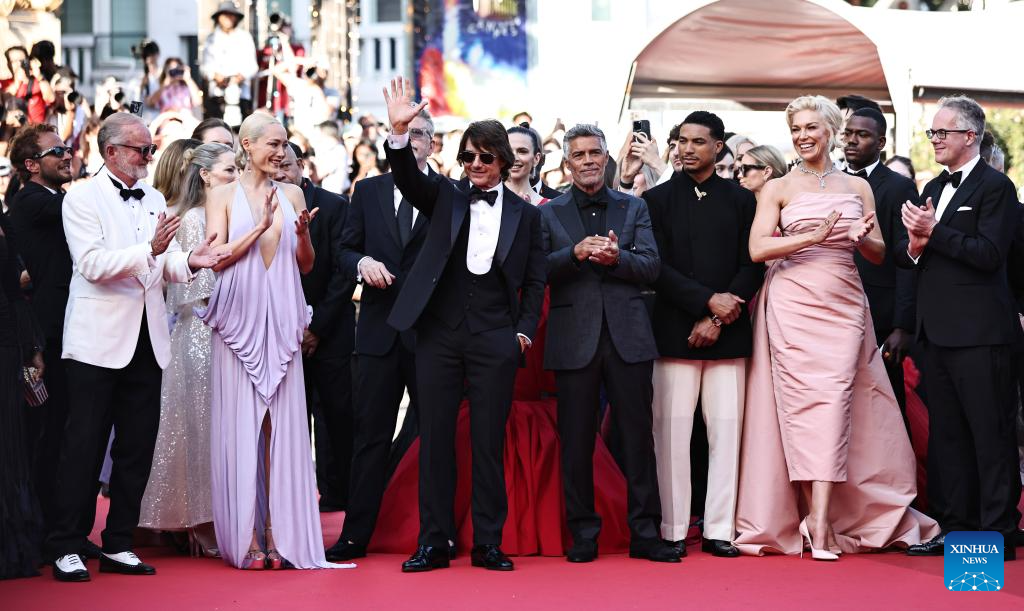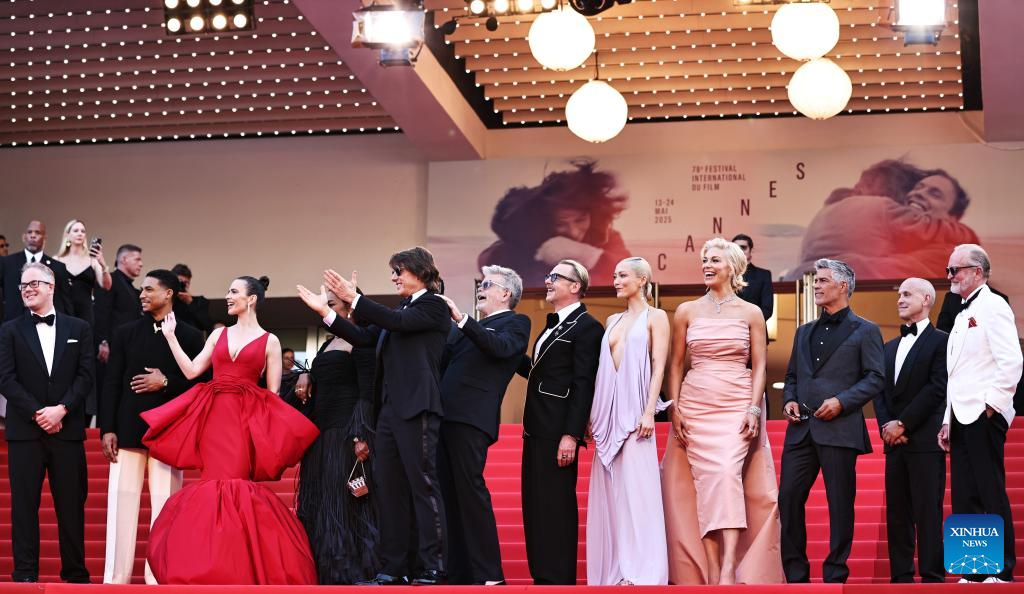 U.S. actor and producer Tom Cruise (3rd R) and cast members of the film "Mission: Impossible - The Final Reckoning" arrive on the red carpet for the world premiere of the film at the 78th edition of the Cannes Film Festival in Cannes, southern France, on May 14, 2025. (Xinhua/Gao Jing)