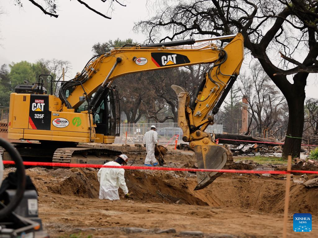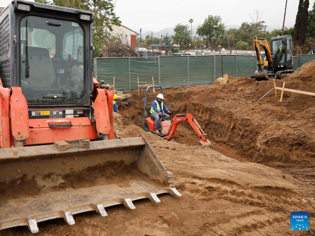 Construction workers perform tasks in Altadena, Los Angeles County, California, the United States, on May 2, 2025. (Photo by Qiu Chen/Xinhua)