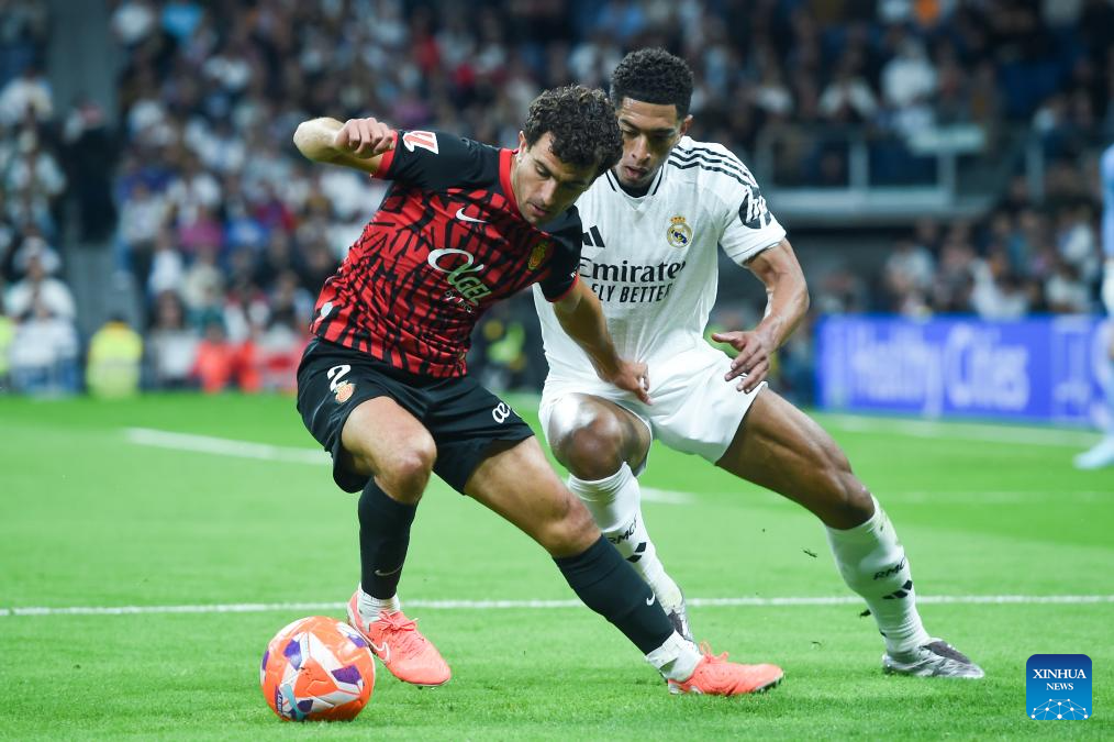 Jude Bellingham (R) of Real Madrid vies with Mateu Morey of RCD Mallorca during the Laliga football match between Real Madrid and RCD Mallorca in Madrid, Spain, on May 14, 2025. (Photo by Gustavo Valiente/Xinhua)