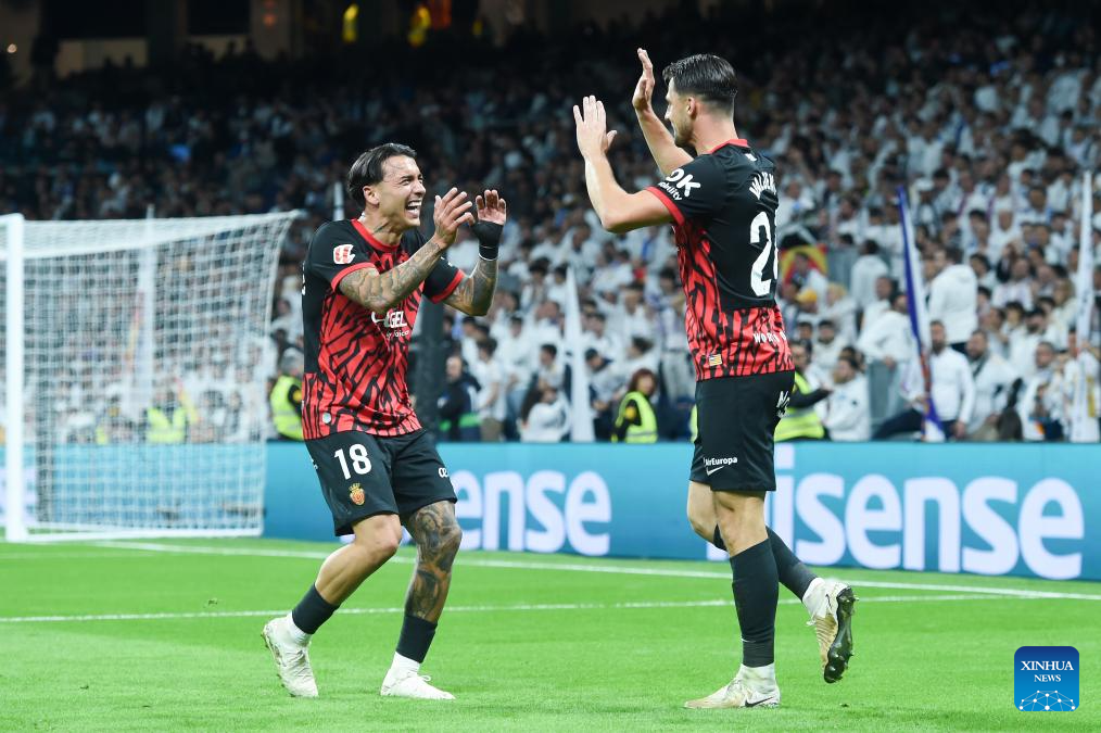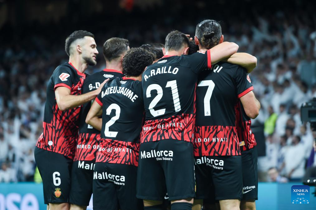 Players of RCD Mallorca celebrate a goal by Martin Valjent during the Laliga football match between Real Madrid and RCD Mallorca in Madrid, Spain, on May 14, 2025. (Photo by Gustavo Valiente/Xinhua)