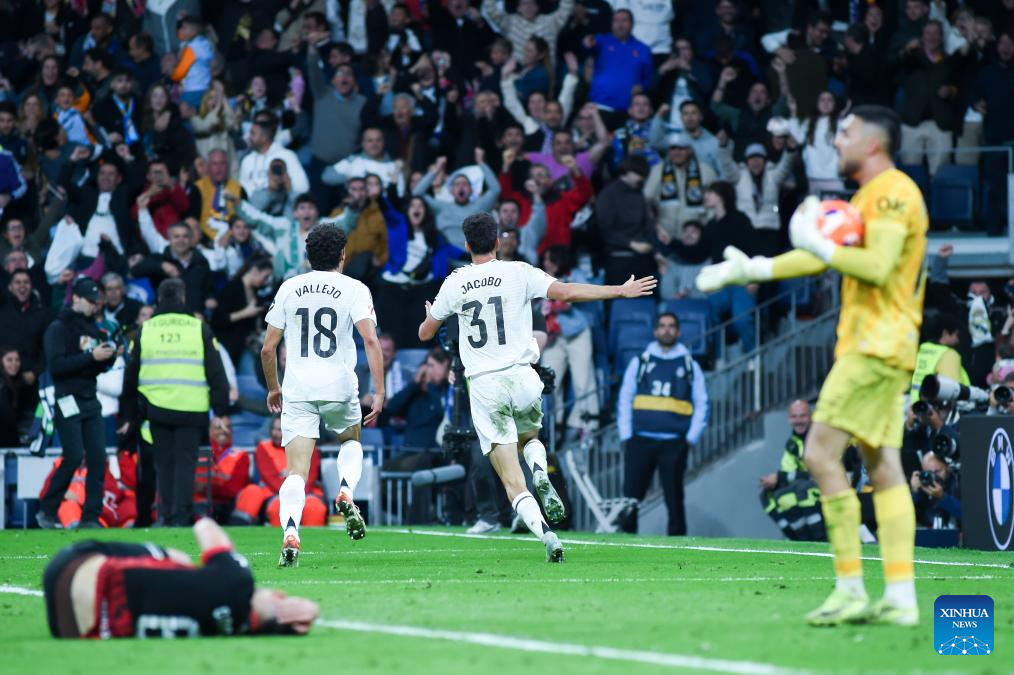 Jacobo Ramon (C) of Real Madrid celebrates his goal during the Laliga football match between Real Madrid and RCD Mallorca in Madrid, Spain, on May 14, 2025. (Photo by Gustavo Valiente/Xinhua)