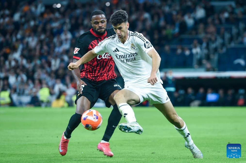 Jacobo Ramon (R) of Real Madrid vies with Cyle Larin of RCD Mallorca during the Laliga football match between Real Madrid and RCD Mallorca in Madrid, Spain, on May 14, 2025. (Photo by Gustavo Valiente/Xinhua)